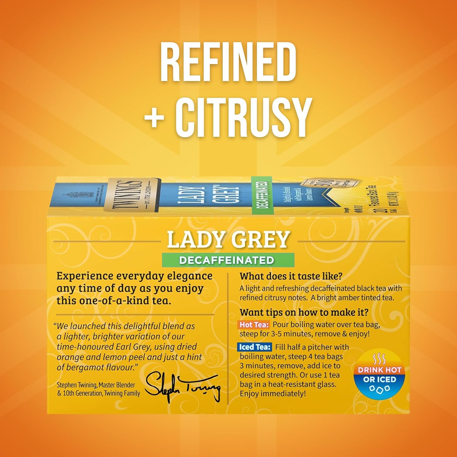 Twinings Decaffeinated Lady Grey Black Tea Individually Wrapped Bags, 20 Count (Pack of 6), Orange Peel & Lemon Peel, Enjoy Hot or Iced, 120 Teabags