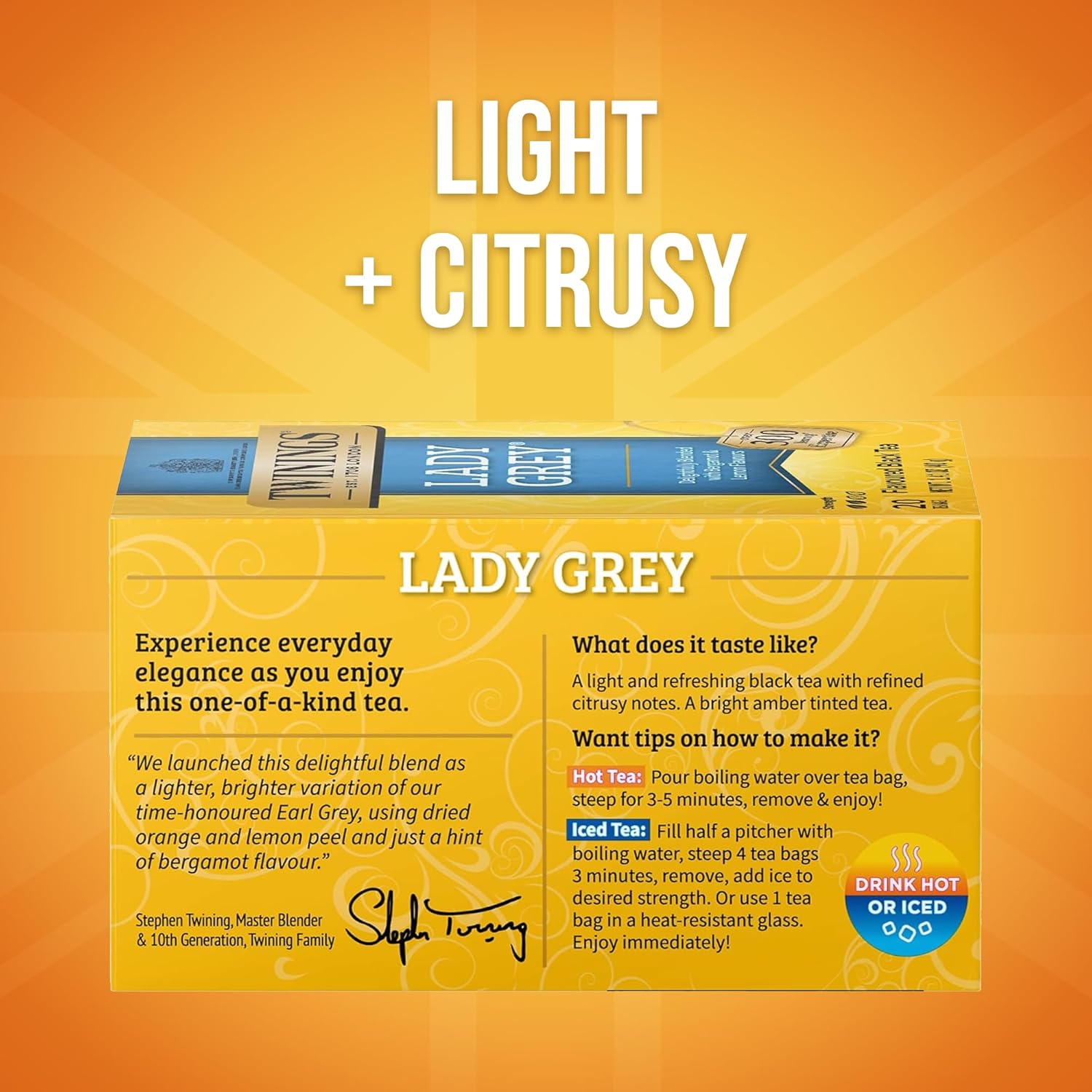 Twinings Lady Grey Black Tea Individually Wrapped Bags, 20 Count (Pack of 6), Orange & Lemon Peel with a Hint of Bergamot, Caffeinated, Enjoy Hot or Iced, 120 Teabags
