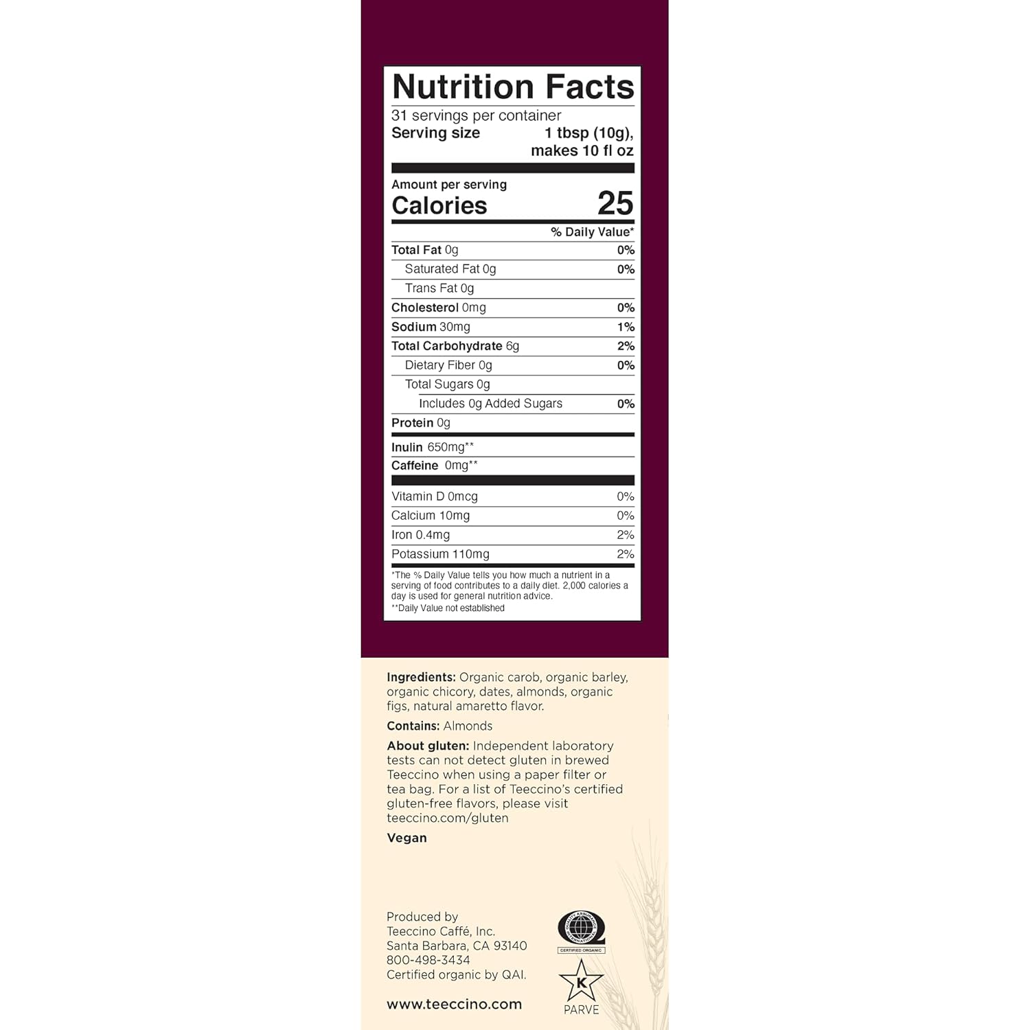 Teeccino Almond Amaretto Chicory Coffee Alternative - Ground Herbal Coffee That’s Prebiotic, Caffeine Free & Acid Free, Medium Roast, 11 Ounce (Pack of 6)