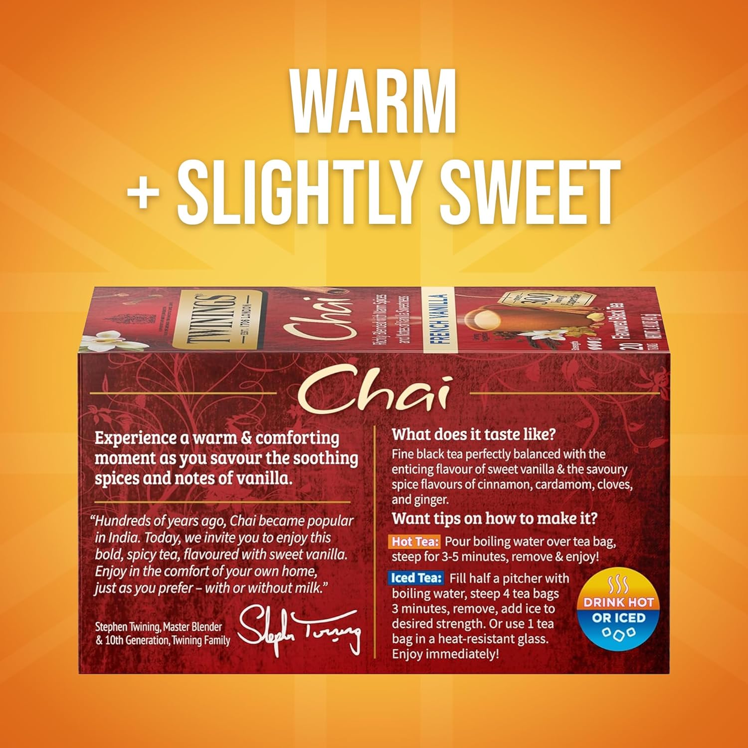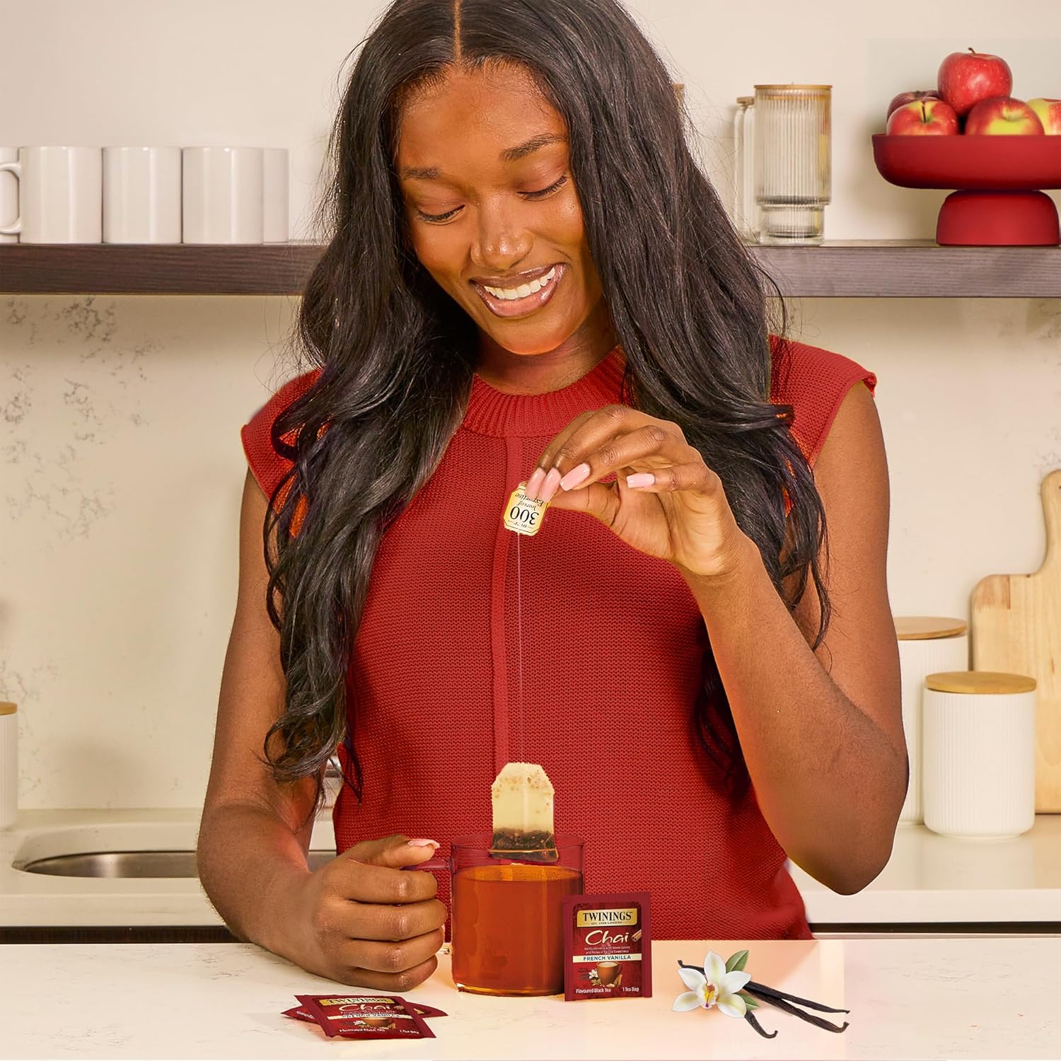 Twinings French Vanilla Chai Black Tea Individually Wrapped Bags, 20 Count (Pack of 6), Warm, Sweet & Spicy, Caffeinated, Enjoy Hot or Iced, 120 Teabags