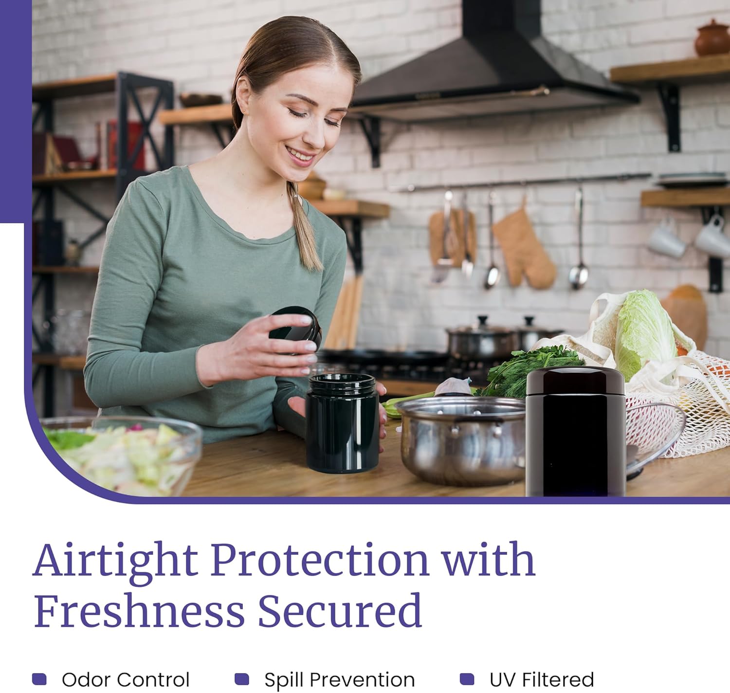 - 𝗔𝗶𝗿𝘁𝗶𝗴𝗵𝘁 𝗮𝗻𝗱 𝗦𝗺𝗲𝗹𝗹-𝗥𝗲𝘀𝗶𝘀𝘁𝗮𝗻𝘁 𝗟𝗶𝗱: Designed with a precision screw-top closure, these jars create a tight seal that helps keep contents fresh while containing strong aromas. The odor-resistant design ensures safe storage for coffee, spices, or dried ingredients, making it ideal for kitchens, pantries, and on-the-go use where secure containment is essential