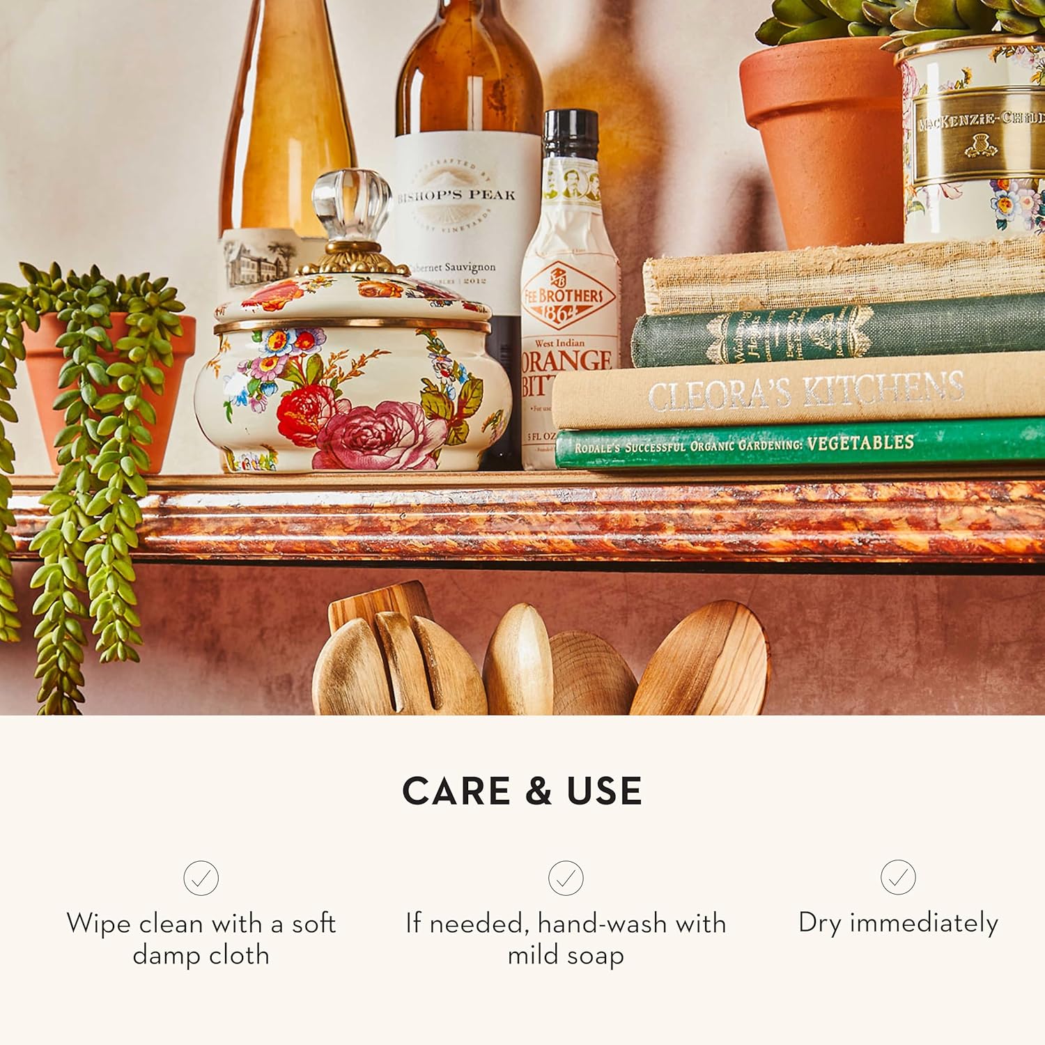 - ELEGANT STORAGE ESSENTIAL: Our Flower Market Enamel Squashed Pot offers a chubby silhouette and holds 20 oz. It features a heavy-gauge steel underbody decorated with hand-applied floral transfers, a bronzed stainless-steel rim, and a glass knob.