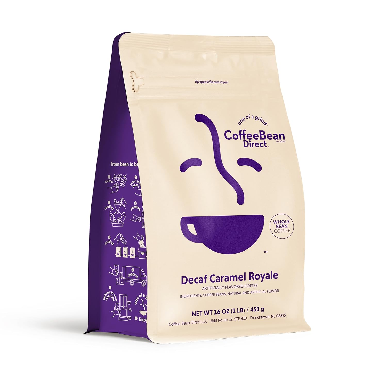 Coffee Bean Direct Decaf Caramel Royale Flavored, Whole Bean Coffee, 1 Pound Bag