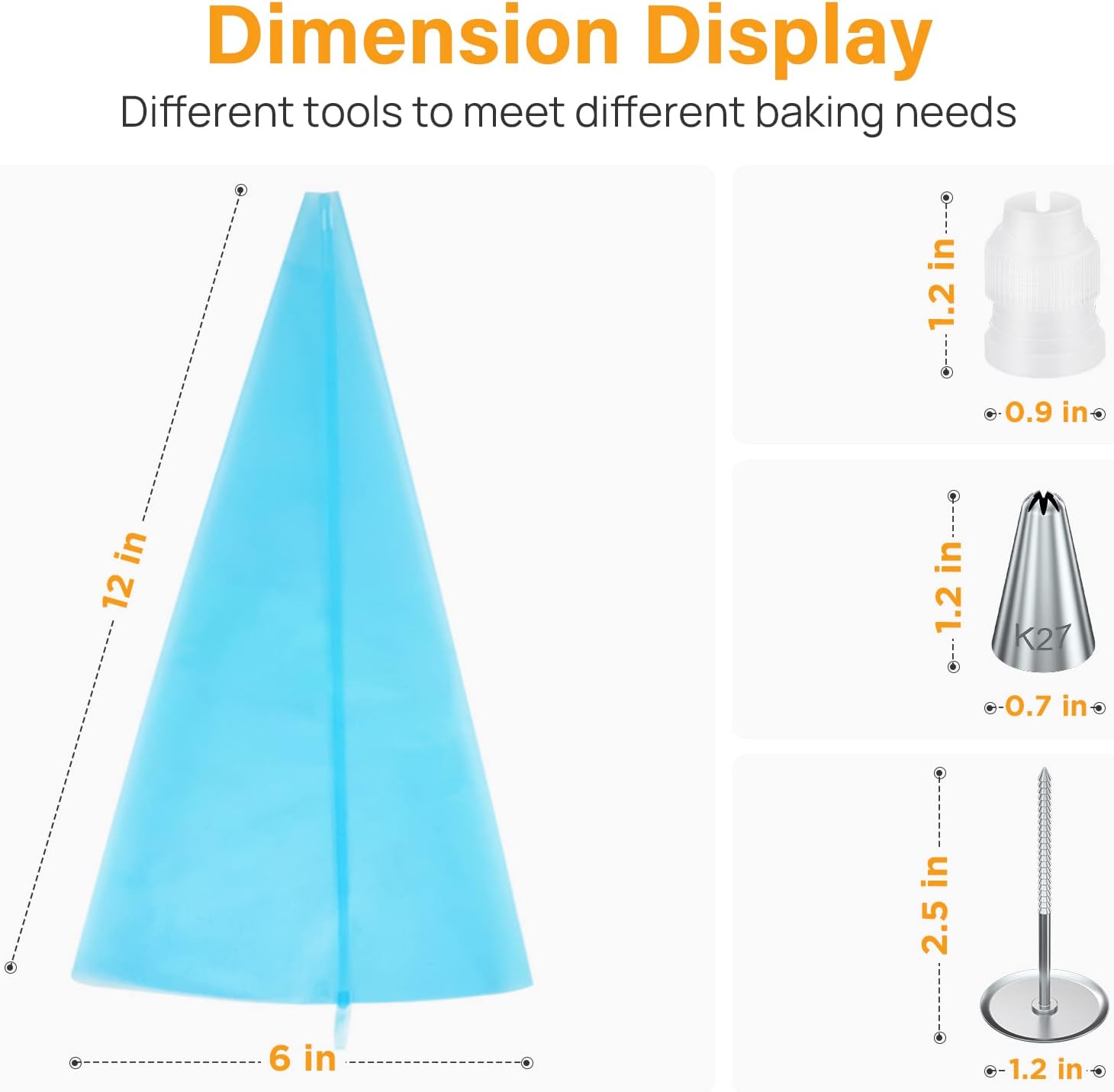 - Frosting tools: 2 Reusable PP couplers are easy to switch quickly from one tip to another tip; 2 flower nails used as a decorative bottom bracket to decorate icing flower.