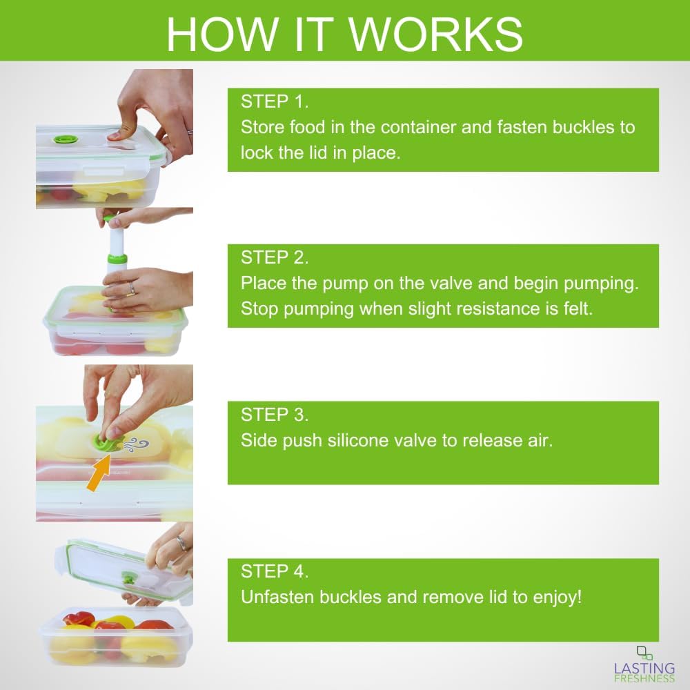 - MEAL PREP CONTAINERS WITH VACUUM: The airtight storage container with vacuum lid features a manual handheld vacuum pump. Pumping out air will help food last up to 5 X longer by slowing the spoilage rate. These air vacuum storage containers are ideal for preparing and storing meals in advance, ensuring that food maintains its quality and taste until ready to be consumed. Marinade in minutes vs hours