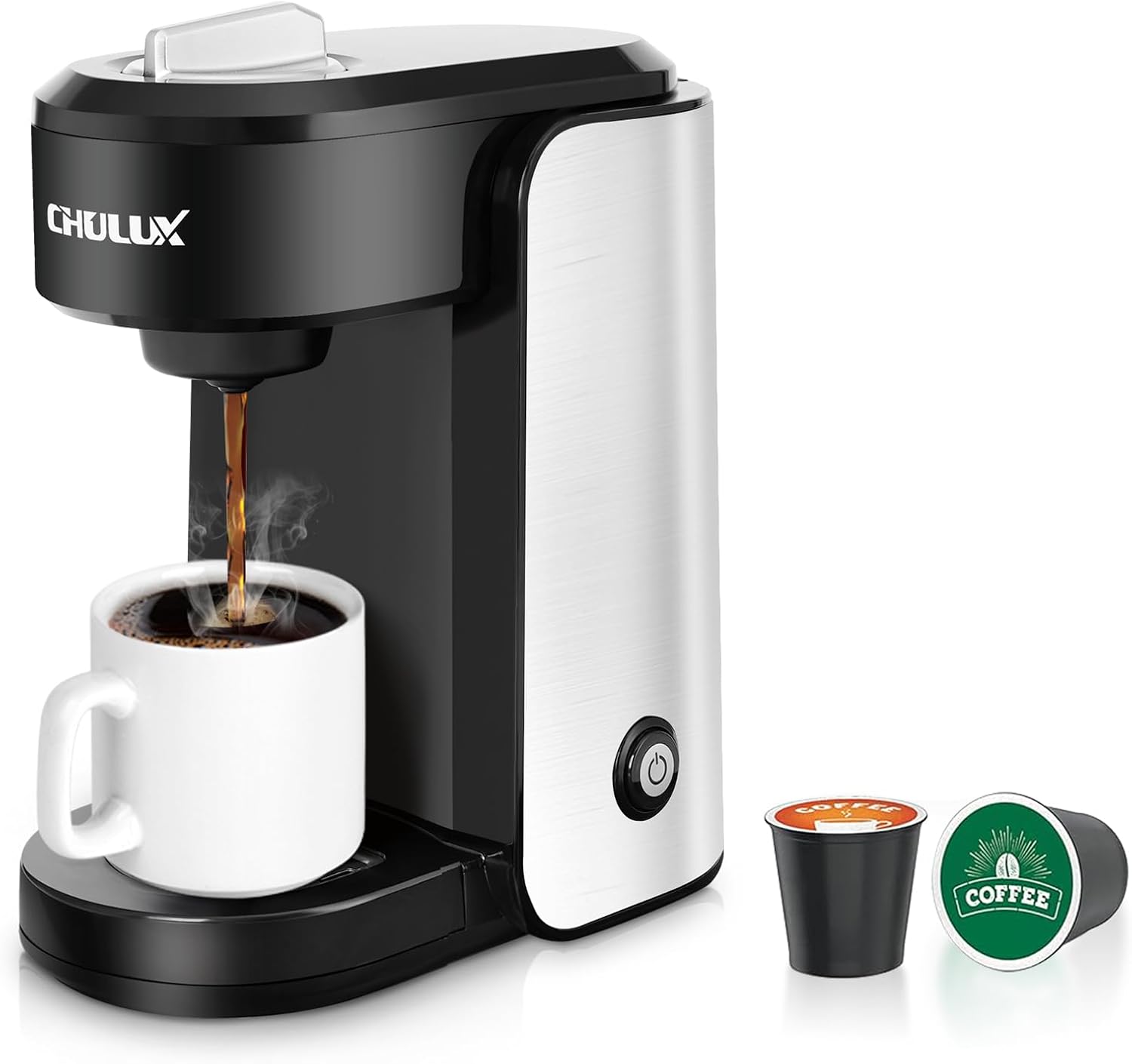 CHULUX Single Serve Coffee Maker, 1000 Watts Single Cup Stainless Steel Coffee Machine for Capsule and Ground Coffee with Graduated Water Tank, One Button Operation