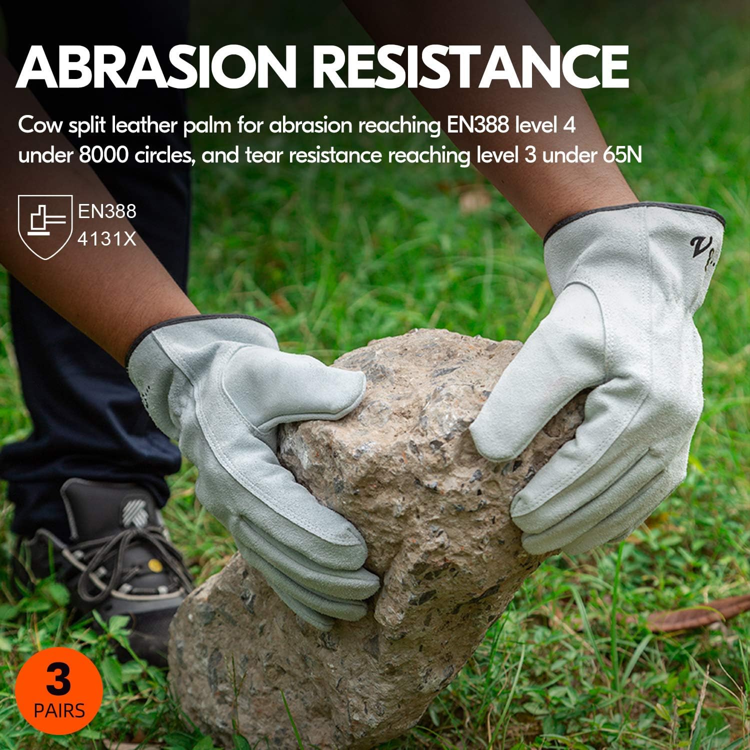 - MATERIAL - Carefully selected high-quality split cowhide is exceptionally durable and puncture-resistant, protecting hands from the hard environment in a wide variety of tasks. Cow split leather for abrasion reaching EN388 level 4 under 8000 circles, and tear resistance reaching level 3 under 65N