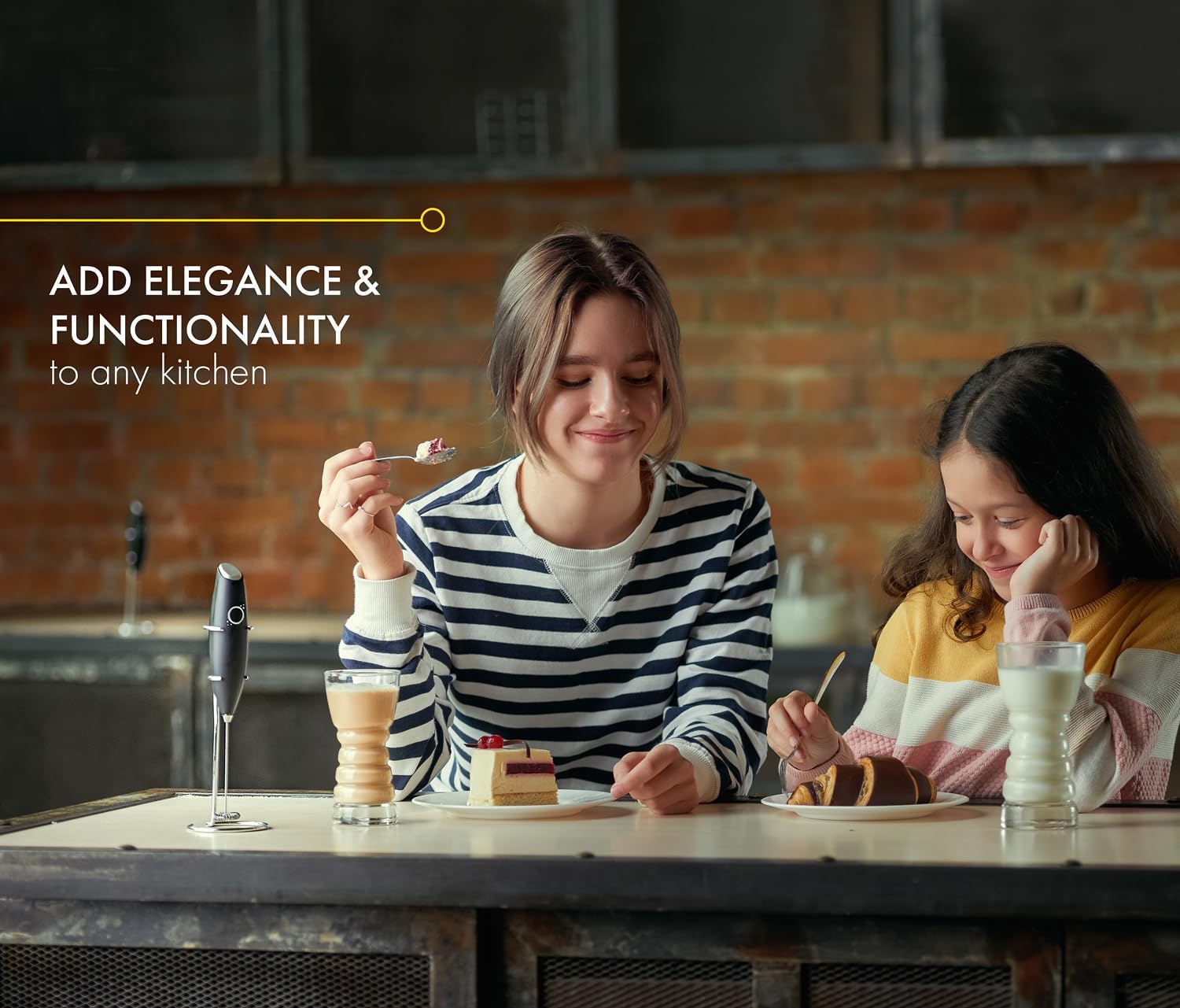 Handheld Milk Frother for Coffee - Stainless Steel Electric Drink Mixer & Matcha Whisk - Ergonomic Hand Frother With Stand & Recipes (Black)