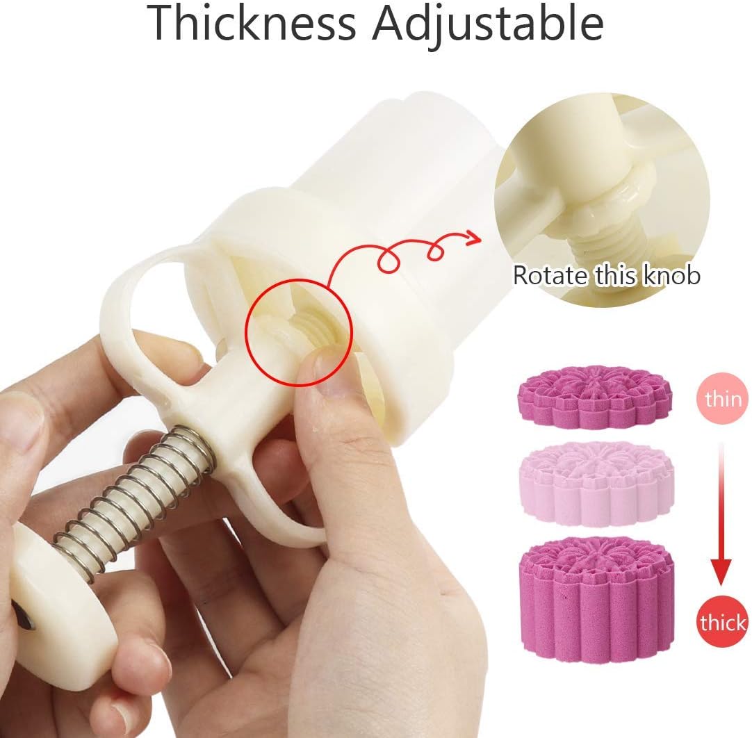 - Ddjuatble Thickness Mold Set: Comes with 6 stamps (1.8 inch diameter) 50 g mooncake mold with various of pattern, you can adjust the height of mold by turn the knob on the handle to make different sizes of cookies, shortbread cookies or mooncakes