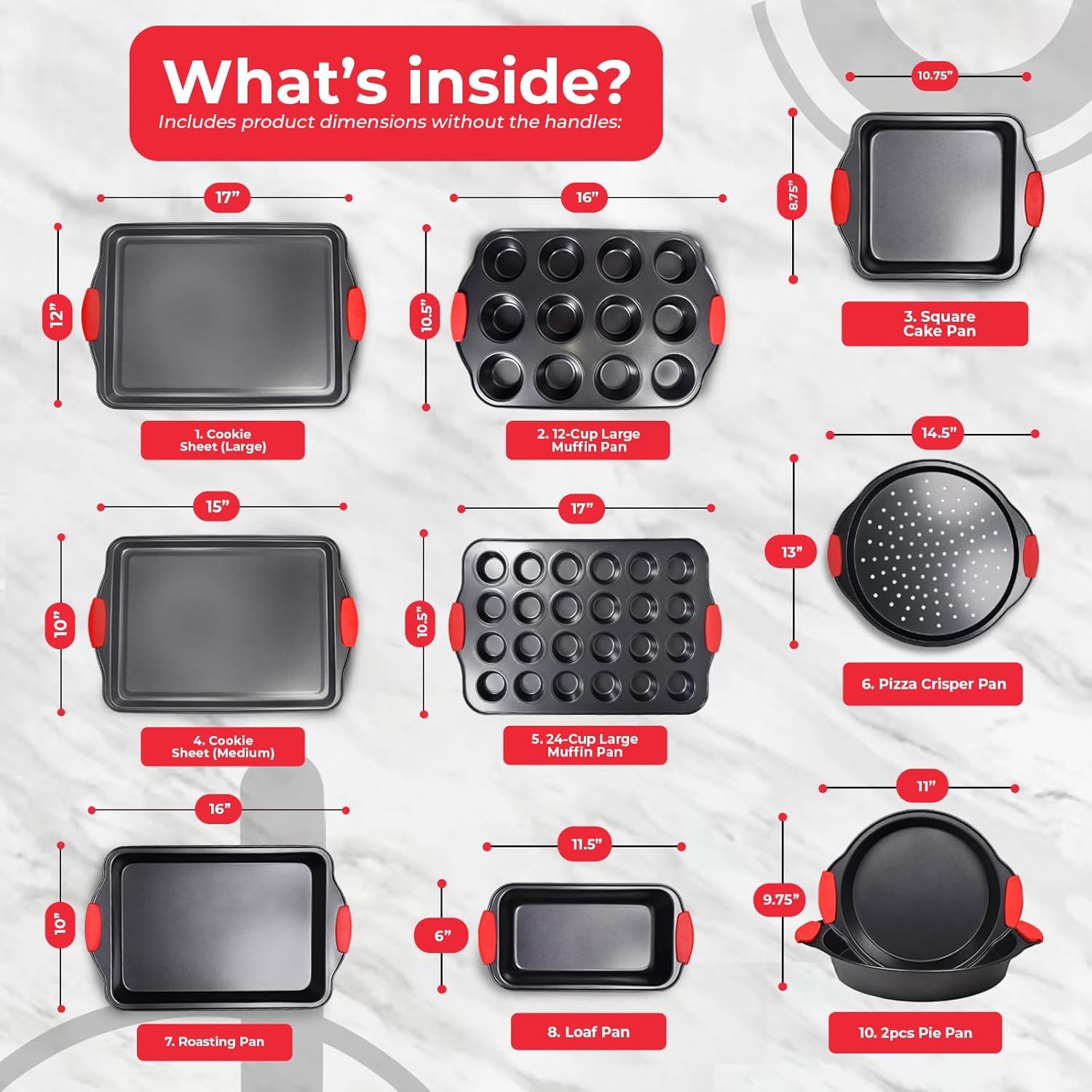 - COMPLETE 10-PIECE BAKEWARE SET: The PERLLI cake baking pan set includes everything you need to bake sweet and savory goods to perfection: large cookie sheet, medium cookie sheet, roasting pan, loaf pan, 12 cup & 24 cup large cupcake pans, square cake pan, pizza crisper pan and 2 pie pans.