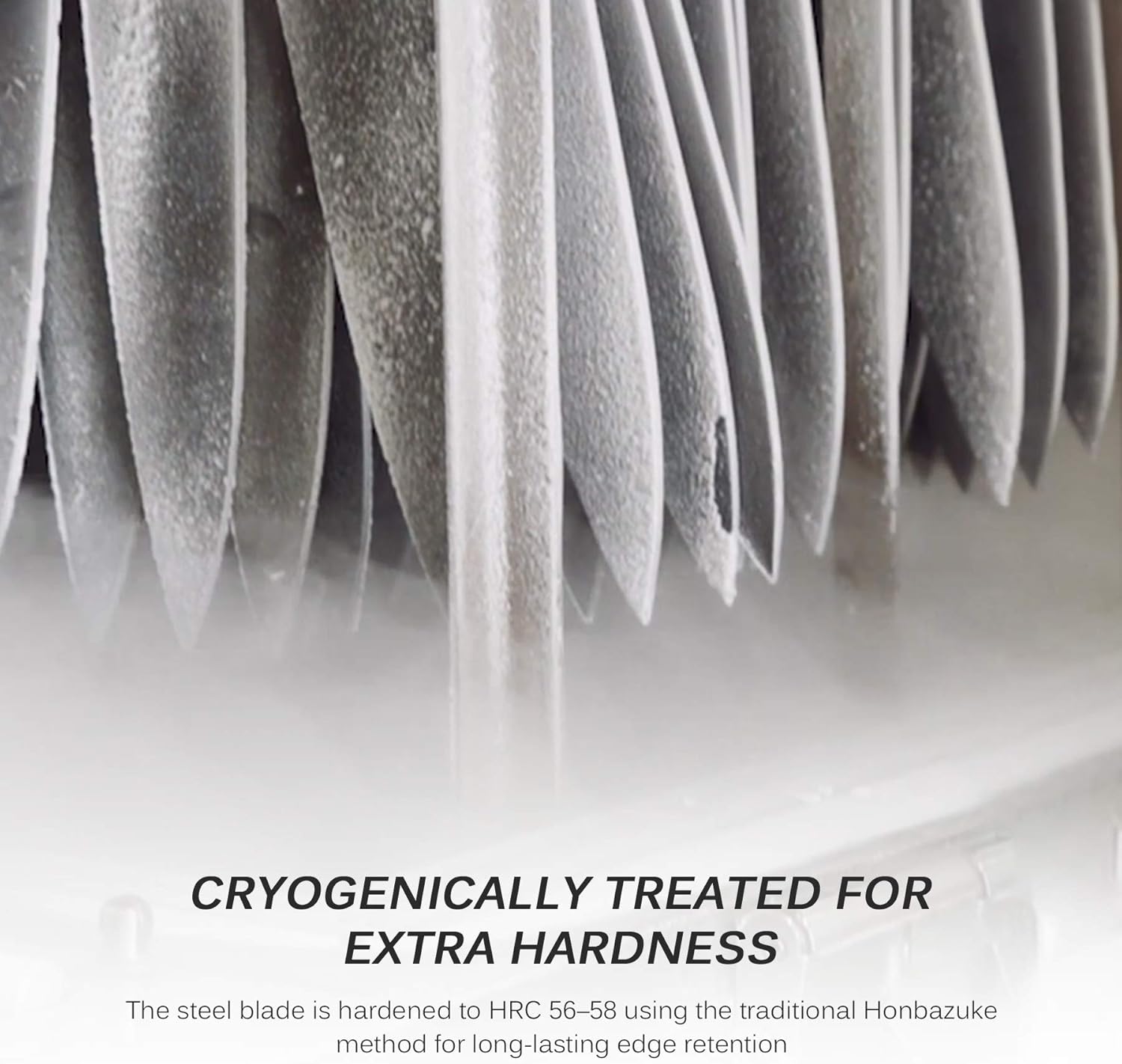 - SUPERIOR STEEL - Manufactured with an ultra-sharp and cryogenically treated steel cutting core at HRC 56-58 hardness, this 7 in. Japanese style Nakiri vegetable knife boasts unrivaled performance and incredible edge retention