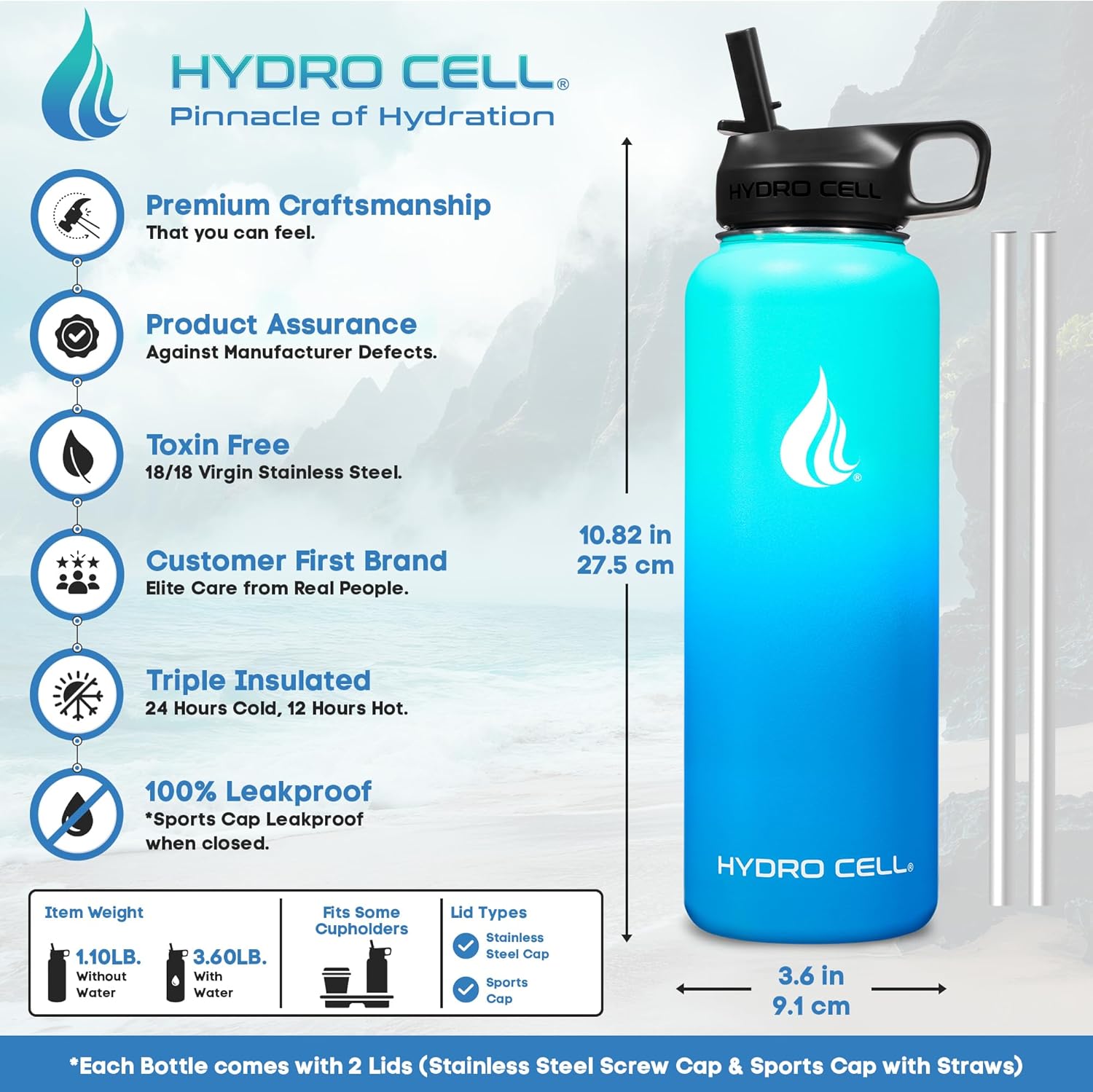 HYDRO CELL Stainless Steel Insulated Water Bottle with Straw - For Cold & Hot Drinks - Metal Vacuum Flask with Screw Cap and Modern Leakproof Sport Thermos for Adults (Teal/Blue 40oz)