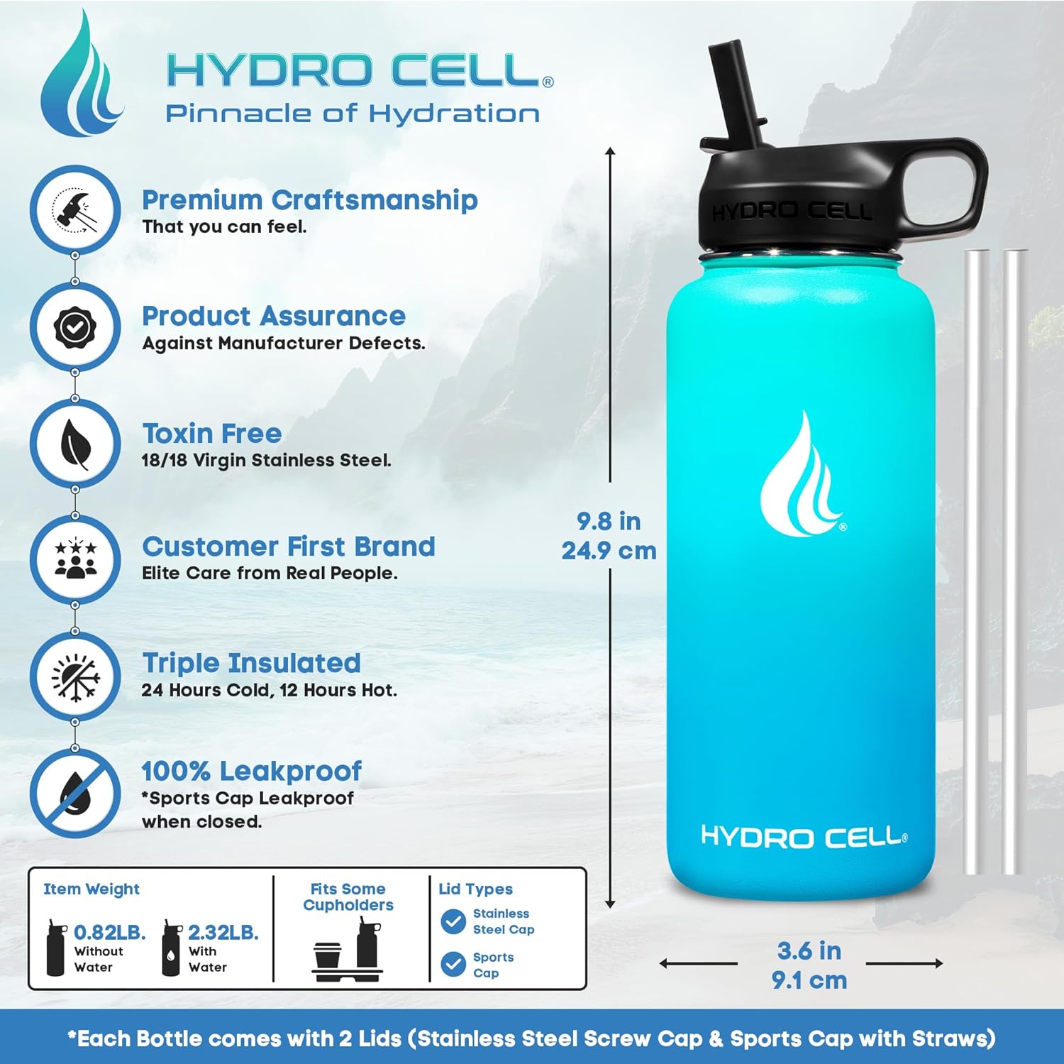- STYLE: Purchase Includes Stainless Steel Bottle, Screw Cap (100% Airtight), Bonus Sports Cap with Straws (Cold Temp ONLY). Hydro Cell offers the largest selection of matching Paracord Handles, Bottle Boots, and Color Replacement Caps: Sold Separate, Linked Below. Customize your Hydro.