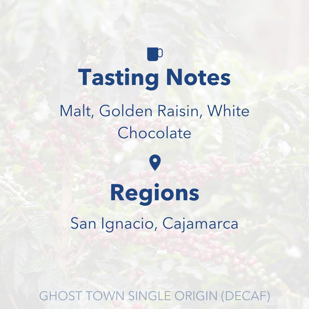 - GHOST TOWN: Decaffeinated using mountain water to create a naturally sweet and round coffee, beginning with a subtle malt flavor, enhanced with a creamy body.