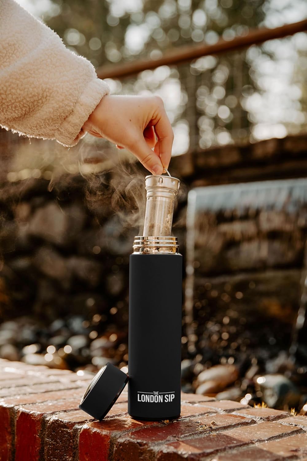 London Sip Multi-Purpose Tea Infuser Travel Mug and Tumbler Fruit Infuser Flask Hot and Cold Double Wall Stainless Steel Thermos with Extra-Long Infuser, Zen Black