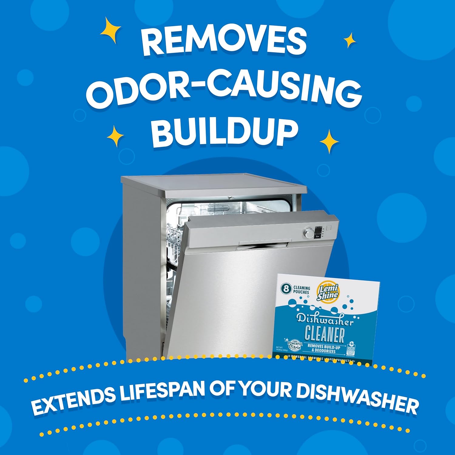 Lemi Shine Natural Dishwasher Cleaner Powered By Citric Acid | 100% Guaranteed Hard Water Cleaning Powder | Eco-Friendly Dishwasher Cleaner and Deodorizer With Fresh Lemon Scent (8 Count)