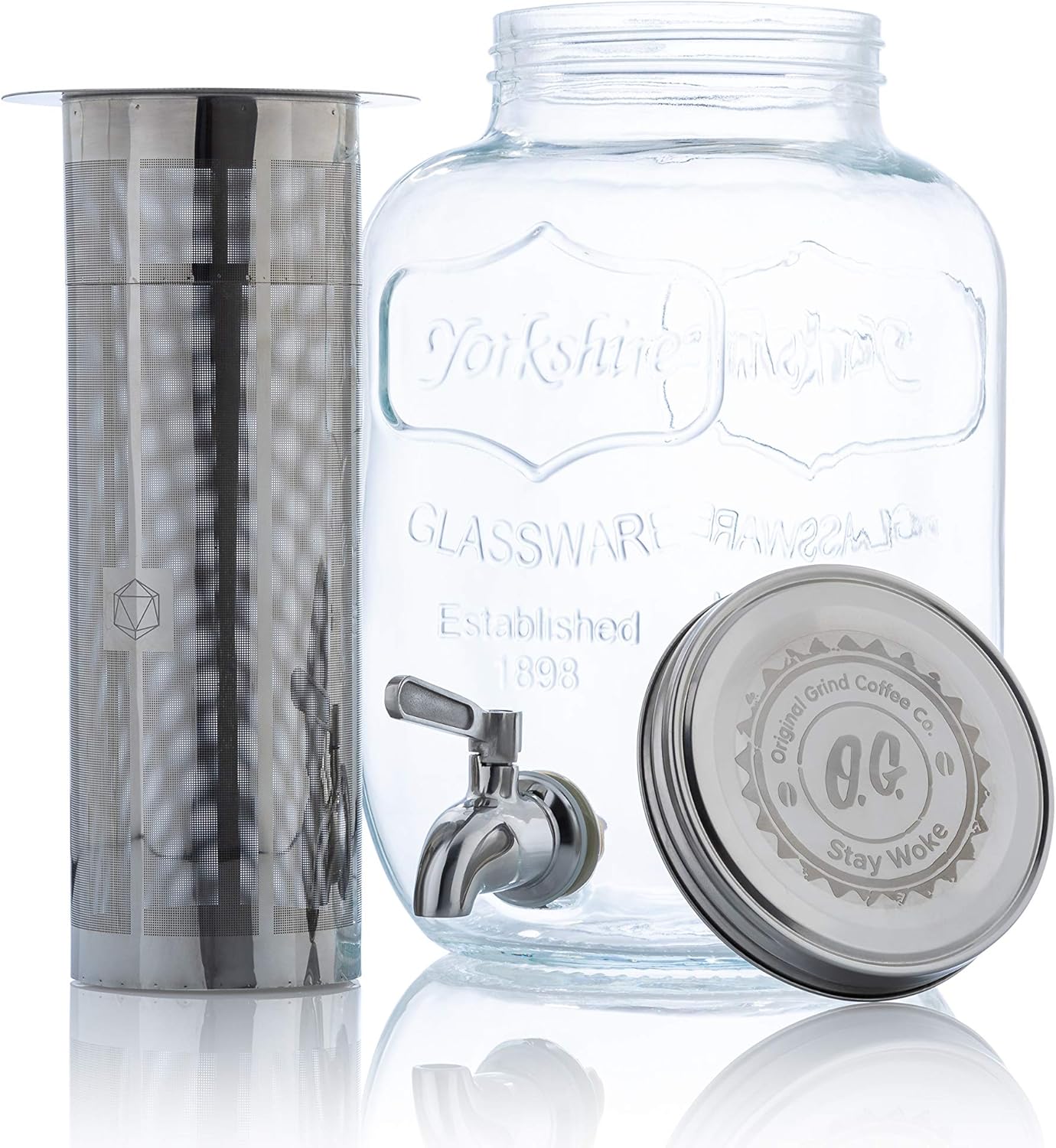 Original Grind Coffee Co.,1 Gallon Cold Brew Coffee Maker,Easy Pour Stainless Steel Spigot Tap,Extra Thick Glass Pitcher Brewing System Iced Coffee Maker,Refrigerator Safe Storage