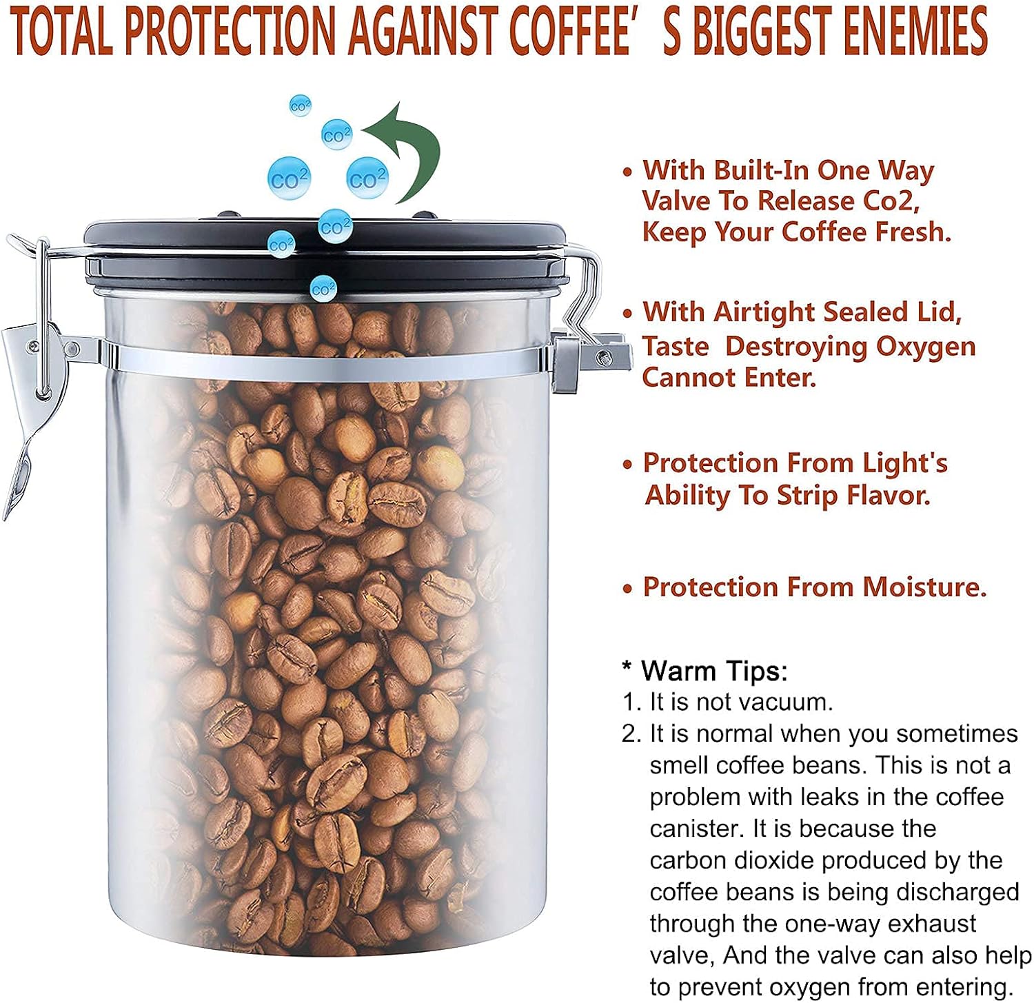 - 2.【AIRTIGHT SEALED VACUUM COFFEE CANISTER】-- This airtight vacuum coffee bean container is with One-way exhaust valve to block the air and release CO2 which would be harmful to coffee’s flavor. Also it is a great airtight sealed vacuum container with reinforced shutting clasp to keep your roasted coffee beans,grounds or tea leaves.