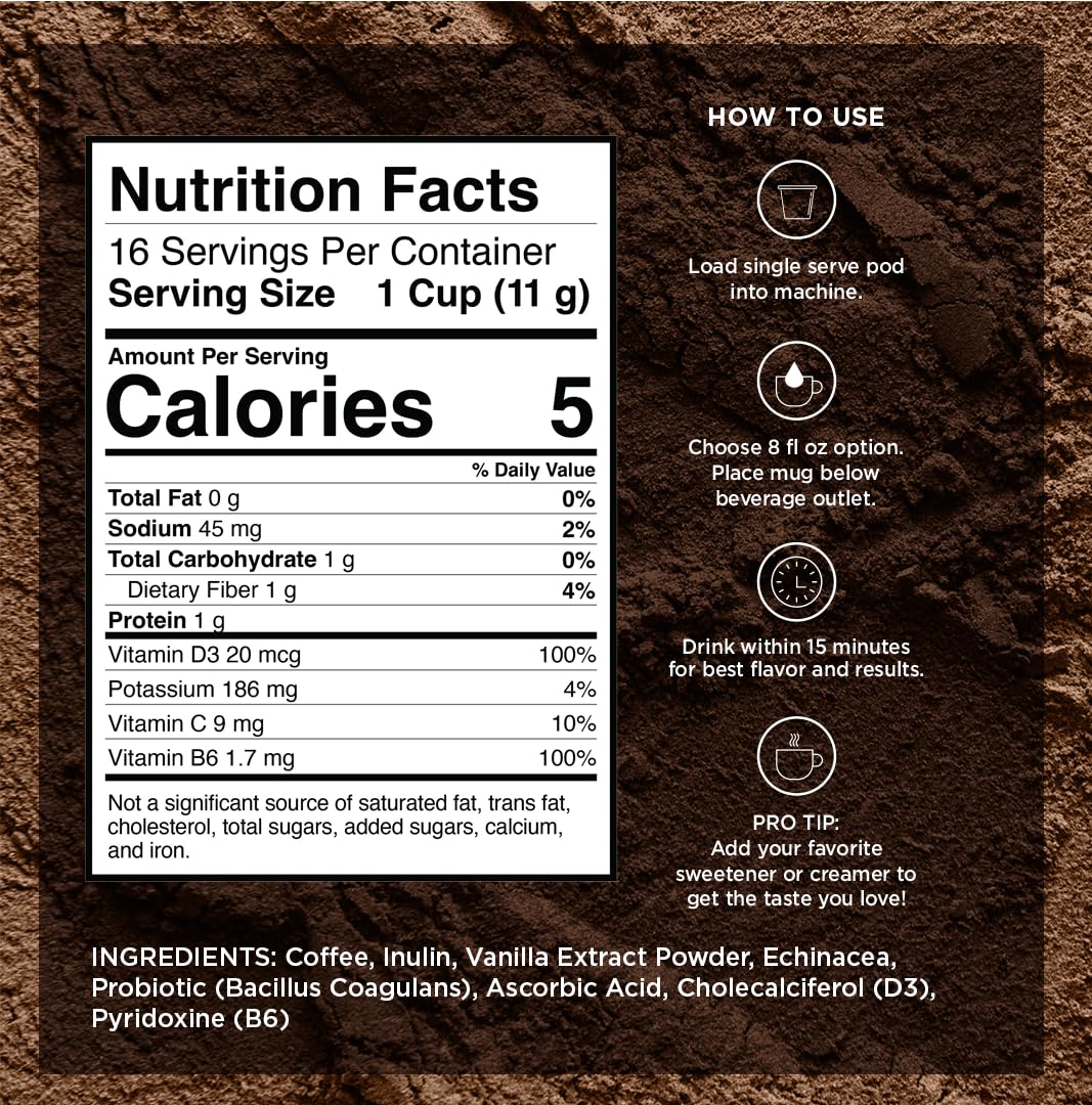 VitaCup Immunity Coffee Pods, Wellness Boost with Antioxidants, Echinacea, Probiotics, Vitamin C & D3, Medium Dark Roast, Recyclable Single Serve Pod Compatible with Keurig K-Cup Brewers,16 Ct