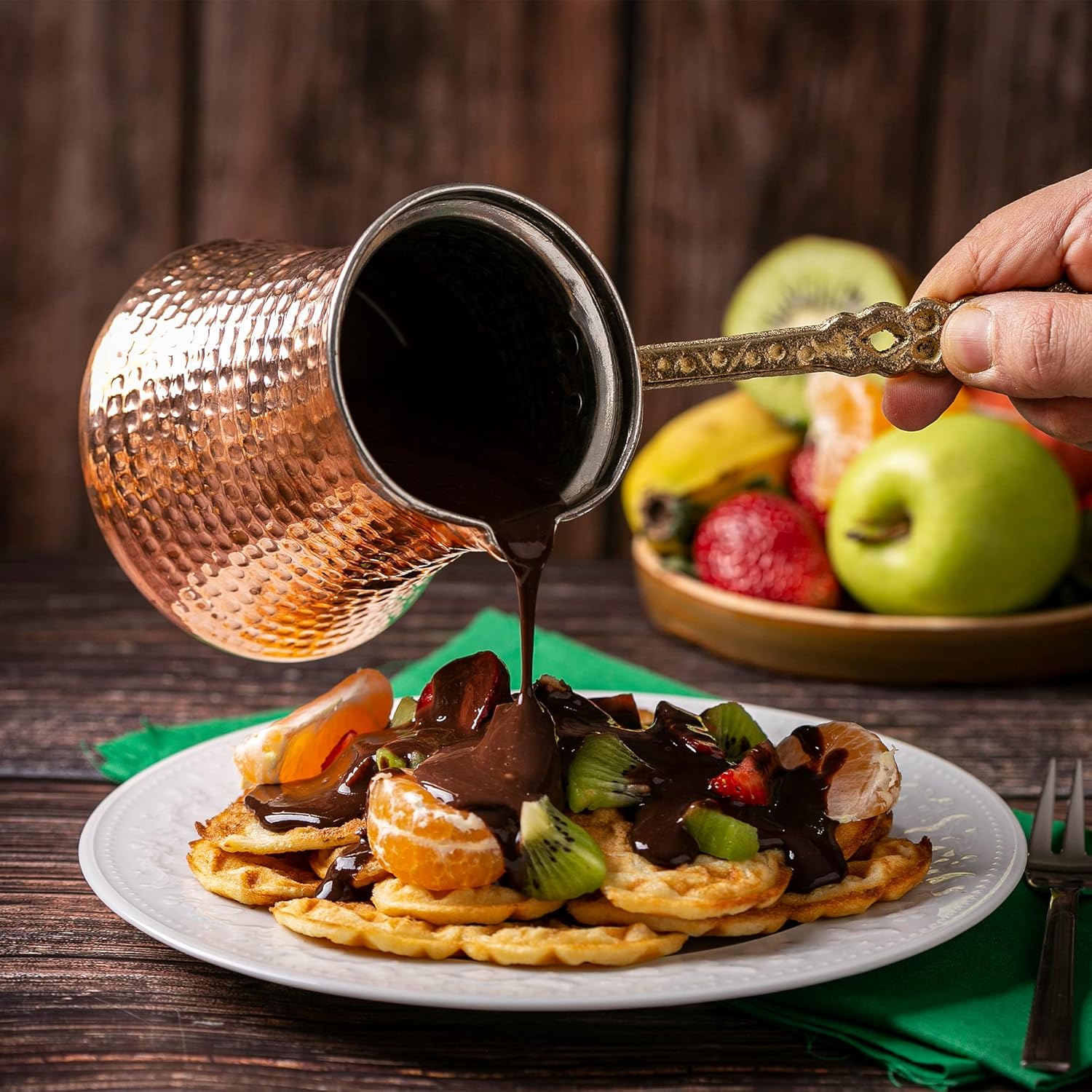 - PERFECT for Turkish Coffee Pot, Greek Coffee Pot, Arabic Coffee Pot, Briki, Milk Pot, Small Sauce Pan or Butter Melter. SPECIAL DESIGN, Strong and Ergonomic Handle, Food Safe Tin Lining Inside. Handle can get hot, please use oven mitts.