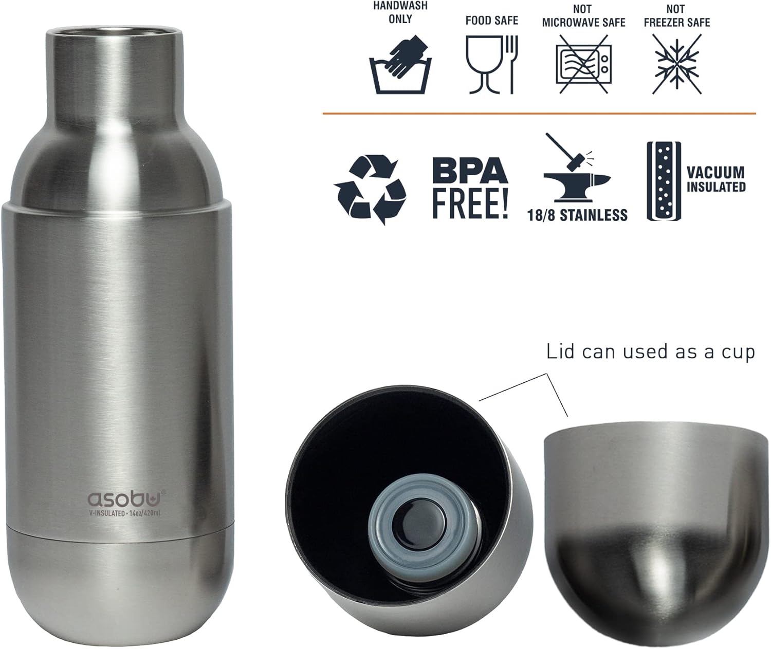 asobu Capsule Bottle Stainless Steel Double Wall Insulated Travel Water Bottle – Lid Doubles as a Cup 14 Ounce (Silver)