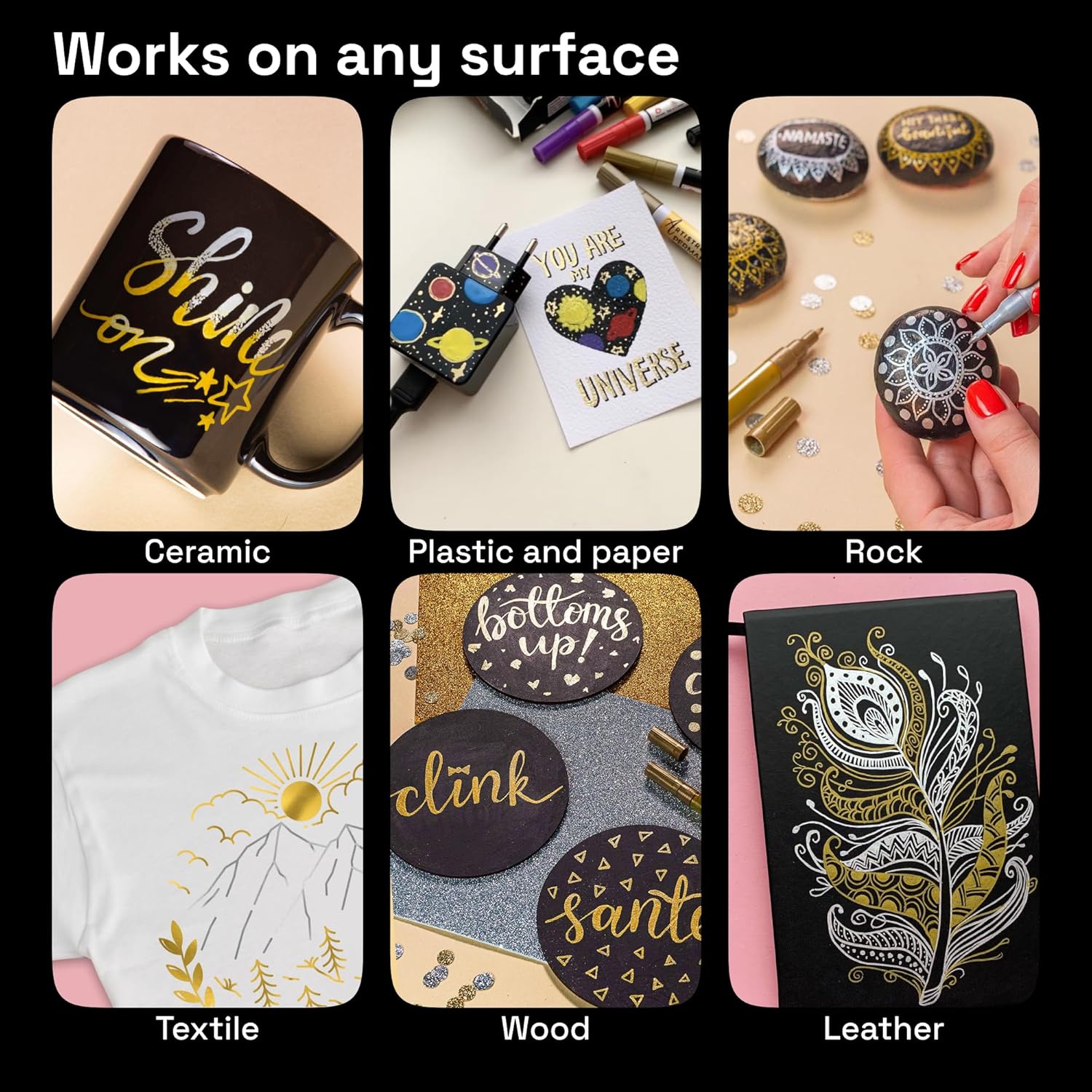 - Professional Quality: Artistro acrylic silver and gold paint pens are equipped with Italian ink and a Japanese nib. Any beginner or professional can use this gold metallic pen. This gold paint marker has no flooding, jamming, or drying out. Plus, the nib is solid even on rough rocks.