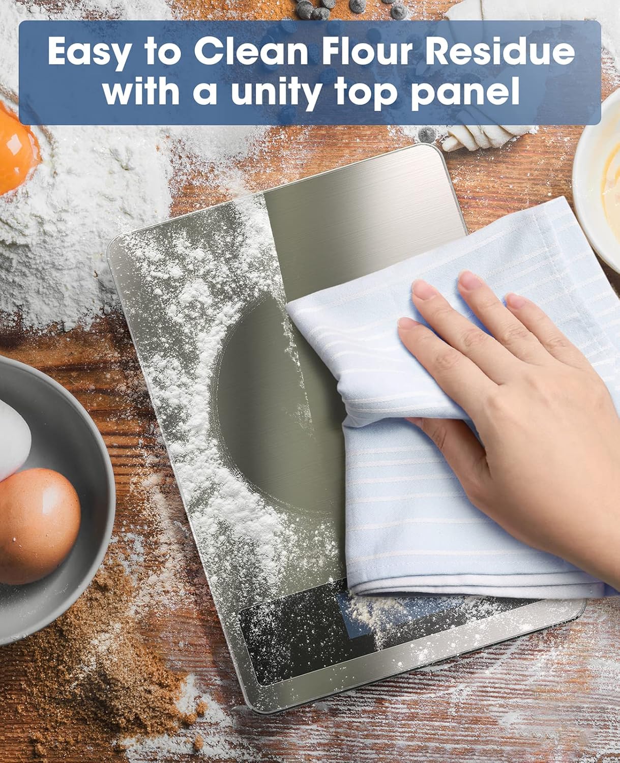 - PRACTICAL DESIGN: The food scale is designed with tempered glass for strong bearing, sleek stainless steel top surface for anti-fingerprint and easy clean, with a attached hook for convenient storage. REMINDING: there is a blue color protective film on the top to prevent from scratches, just tear off before use.