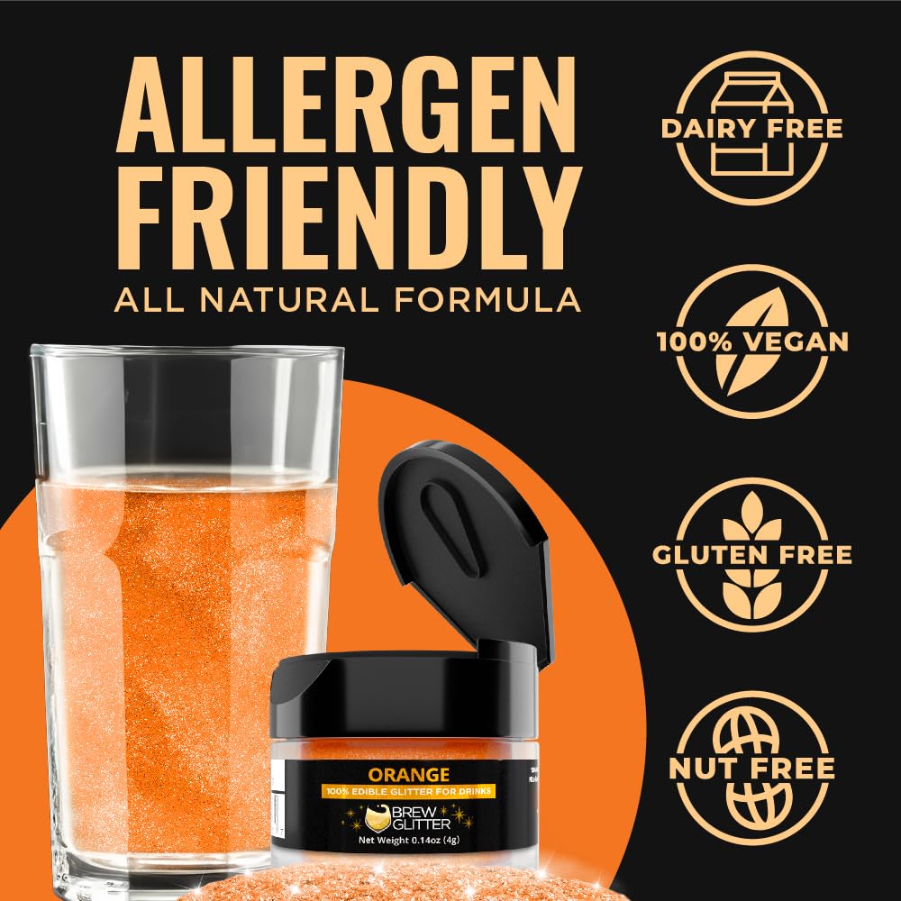 - 🌿 Brew Glitter orange drink glitter is made in the USA at SQF III, GMP, Halal, and Kosher certified facilities, and is nut-free, gluten-free, and vegan.