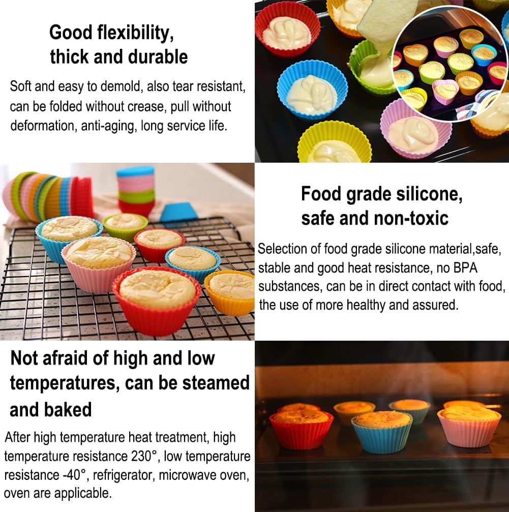 - 【A versatile and perfect baking tool】 - Perfect for making muffins, mousse, bread, pudding, tarts, jelly, brownie cupcakes, chocolate, soap, and more. Our silicone baking cups can be used for most parties, weddings, birthdays, baby parties, dining, Halloween, Thanksgiving, and Christmas baking.