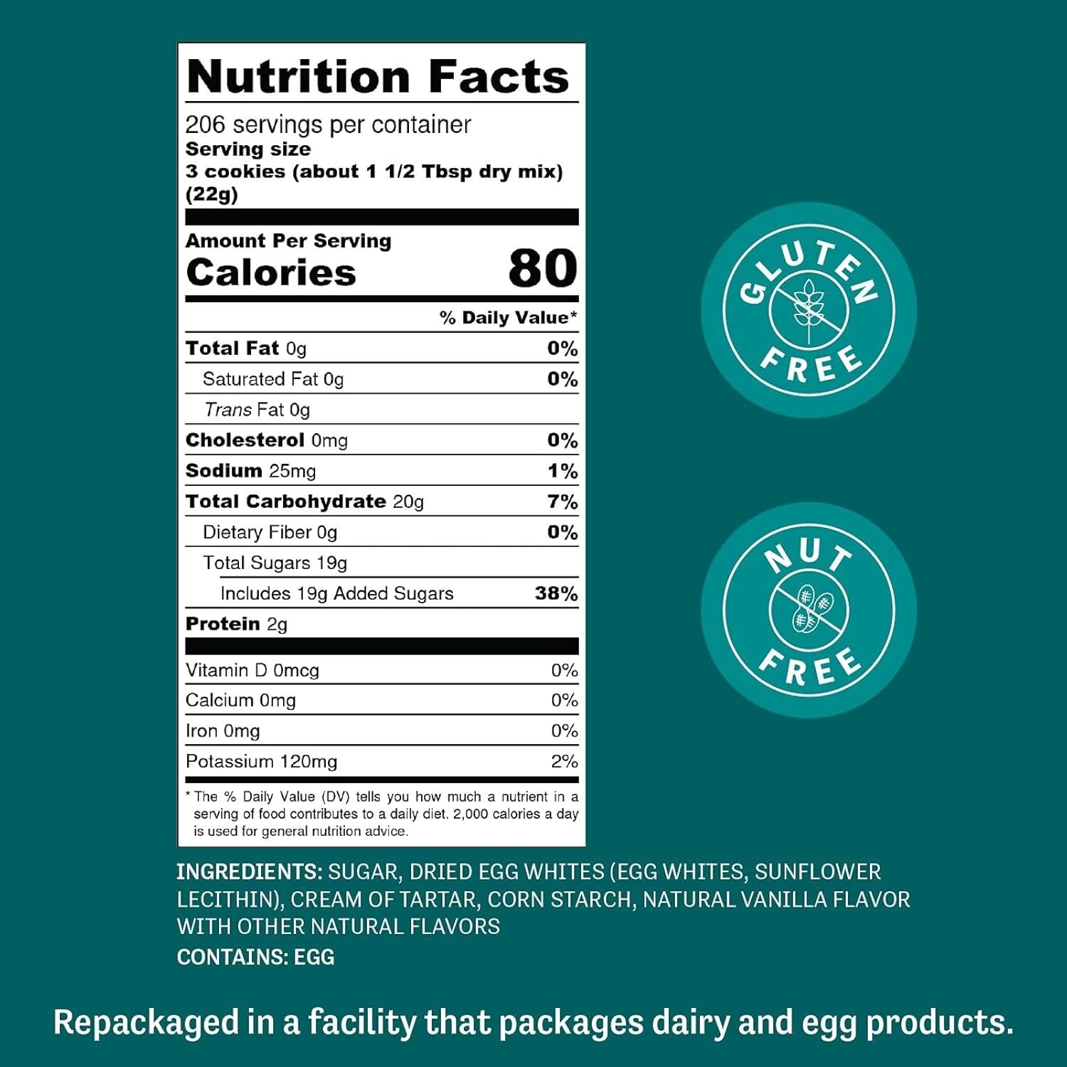 - Natural Flavor Profile: The meringue flavor is enhanced by simple ingredients including sugar, dried egg white powder, cream of tartar, corn starch, and natural vanilla flavor. Enjoy a nut-free, room temperature stable product with expiration clearly marked on the package