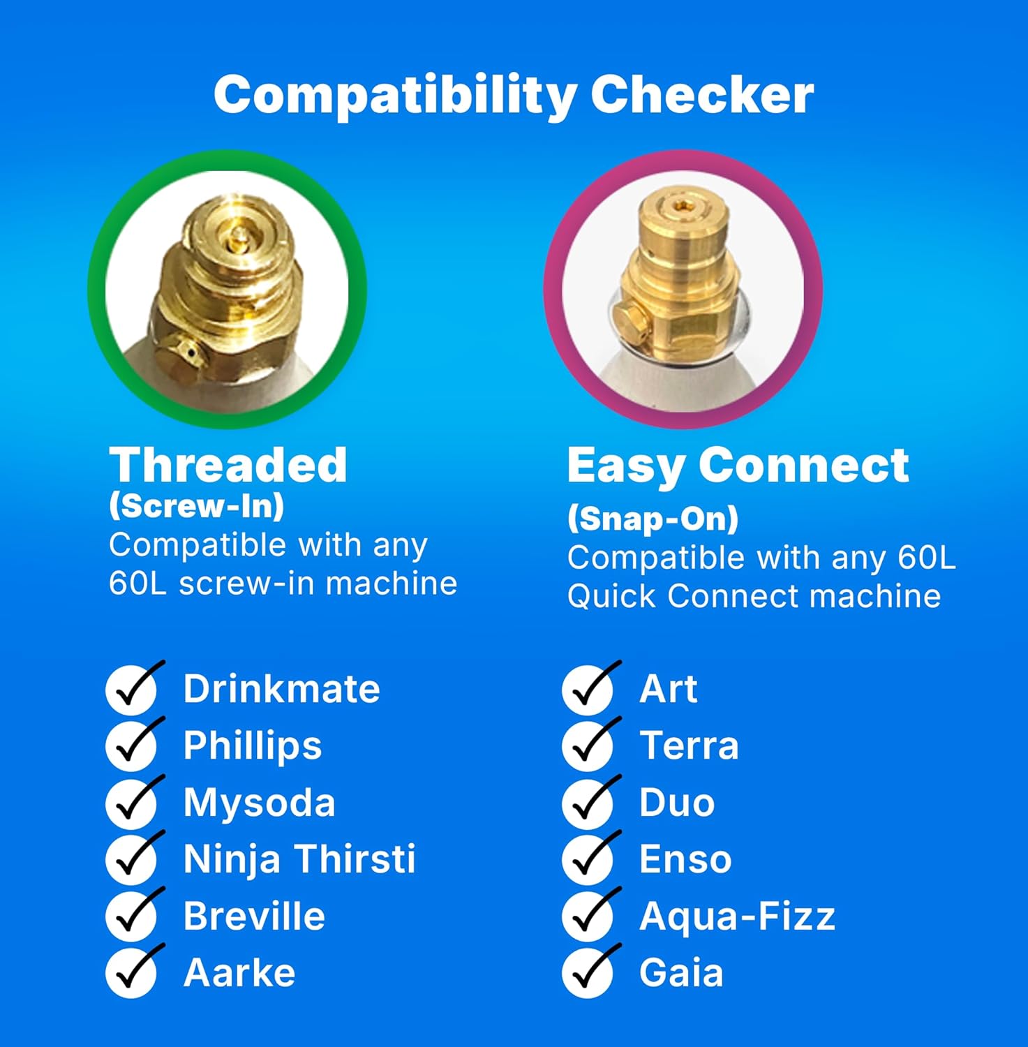 - [Canister Compatibility] We don't mind if you call it a canister, cylinder, tank, or cartridge! Just remember that our green capped, threaded canisters are compatible with screw-in connector soda and sparkling water makers, including SodaStream, Aarke, Philips, and Ninja Thirsti. If you have a SodaStream ART, TERRA, DUO, or other quick connect machine, you will need to purchase our pink capped, Easy Connect canisters.