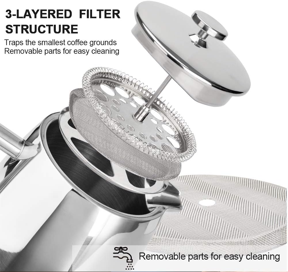 - BONUS Stainless Steel Screen included with this French press coffee maker. The filter screen is easy to disassemble and clean. Stack one or more screens together to give your espresso a more refined taste