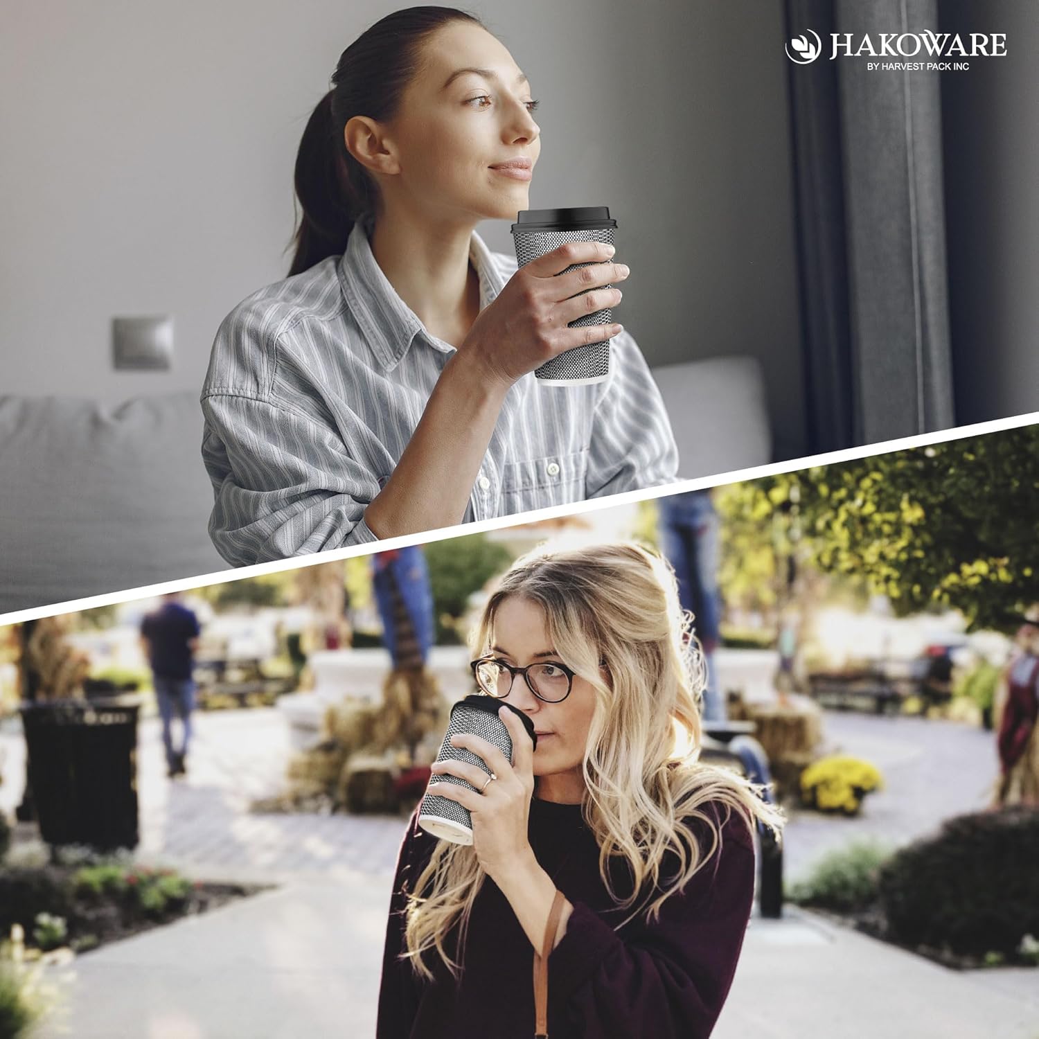 [340 SET]Harvest Pack 16 oz Disposable Coffee Cups, Insulated Ripple Double-Walled Paper Cups with Lids, Black and White Geometric, Bulk Drinking Cups for Tea Hot Chocolate Drinks To go coffee cups