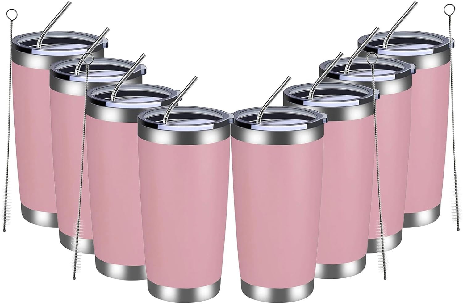 MEWAY 20oz Tumbler 8 Pack Double Wall Vacuum Insulated Travel Mug Bulk, Stainless Steel Tumblers with Lid and Straw, Durable Powder Coated Coffee Cups for Cold & Hot Drinks (Pink, 8)