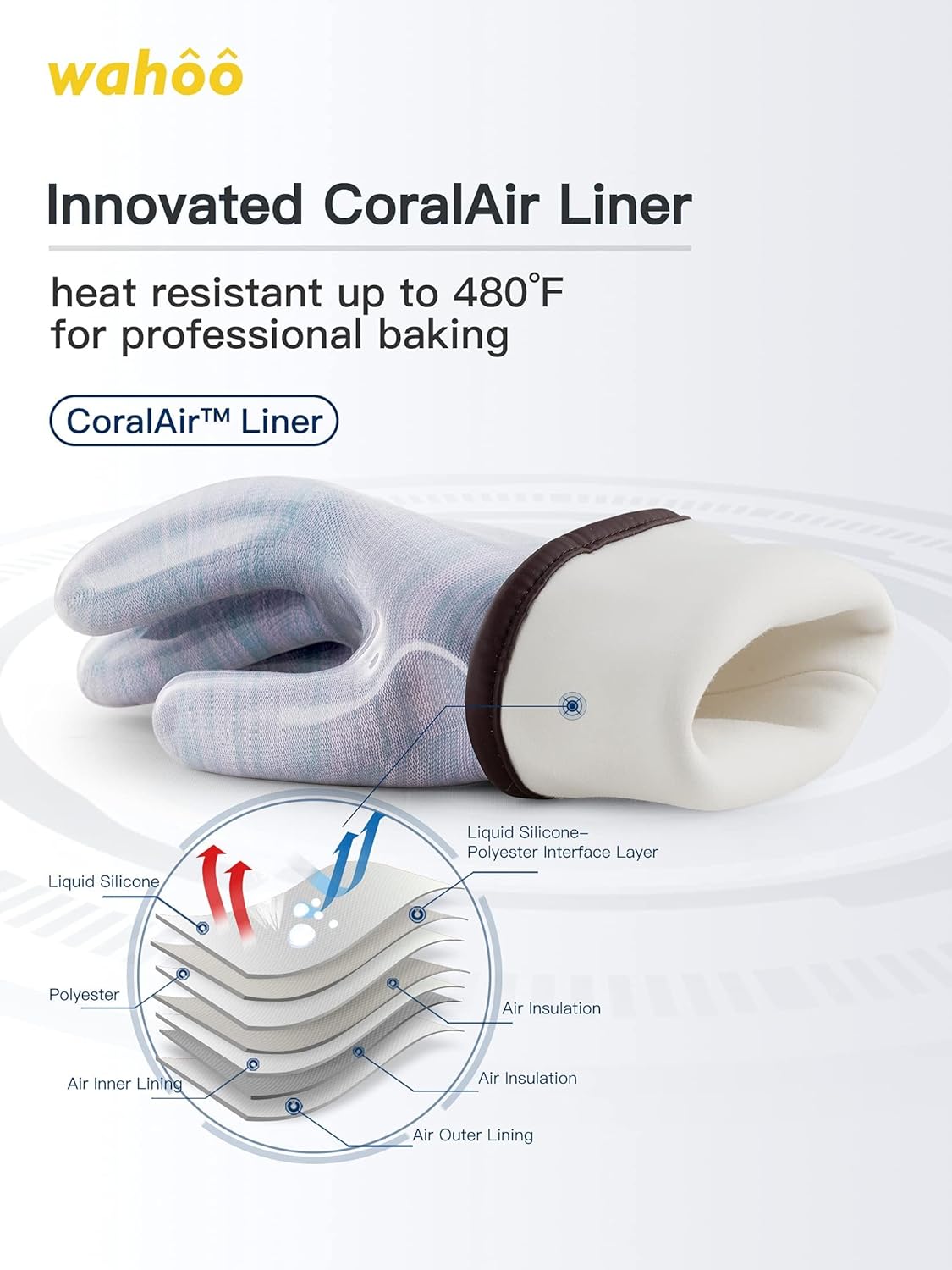 - Seamless Coralair Liner - With 18 gauge seamless CoralAir liner, these grill gloves are breathable, dexterous and pliable, easy to pull on and off, keeping hands cool and free from sweat. And these liquid silicone gloves with separate fingers provide high dexterity and superior grip on grabbing the greasy food and slippery plates.
