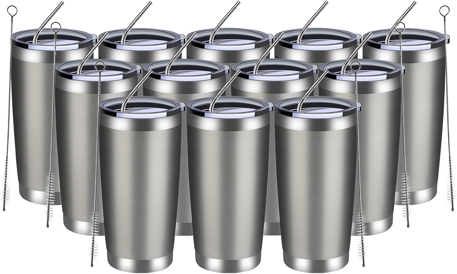 MEWAY 20oz Tumbler 12 Pack Double Wall Vacuum Insulated Travel Mug Bulk, Stainless Steel Tumblers with Lid and Straw, Durable Powder Coated Coffee Cups for Cold & Hot Drinks (Cold Gray, 12)