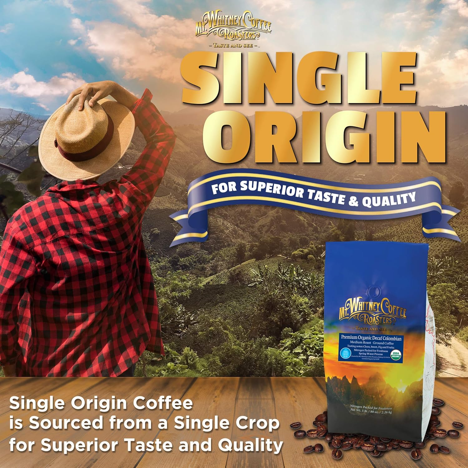 Mt. Whitney Premium Organic Spring Water Colombian, Medium Dark Roast, Low Acid Decaf Coffee (Ground, 5 Lb)