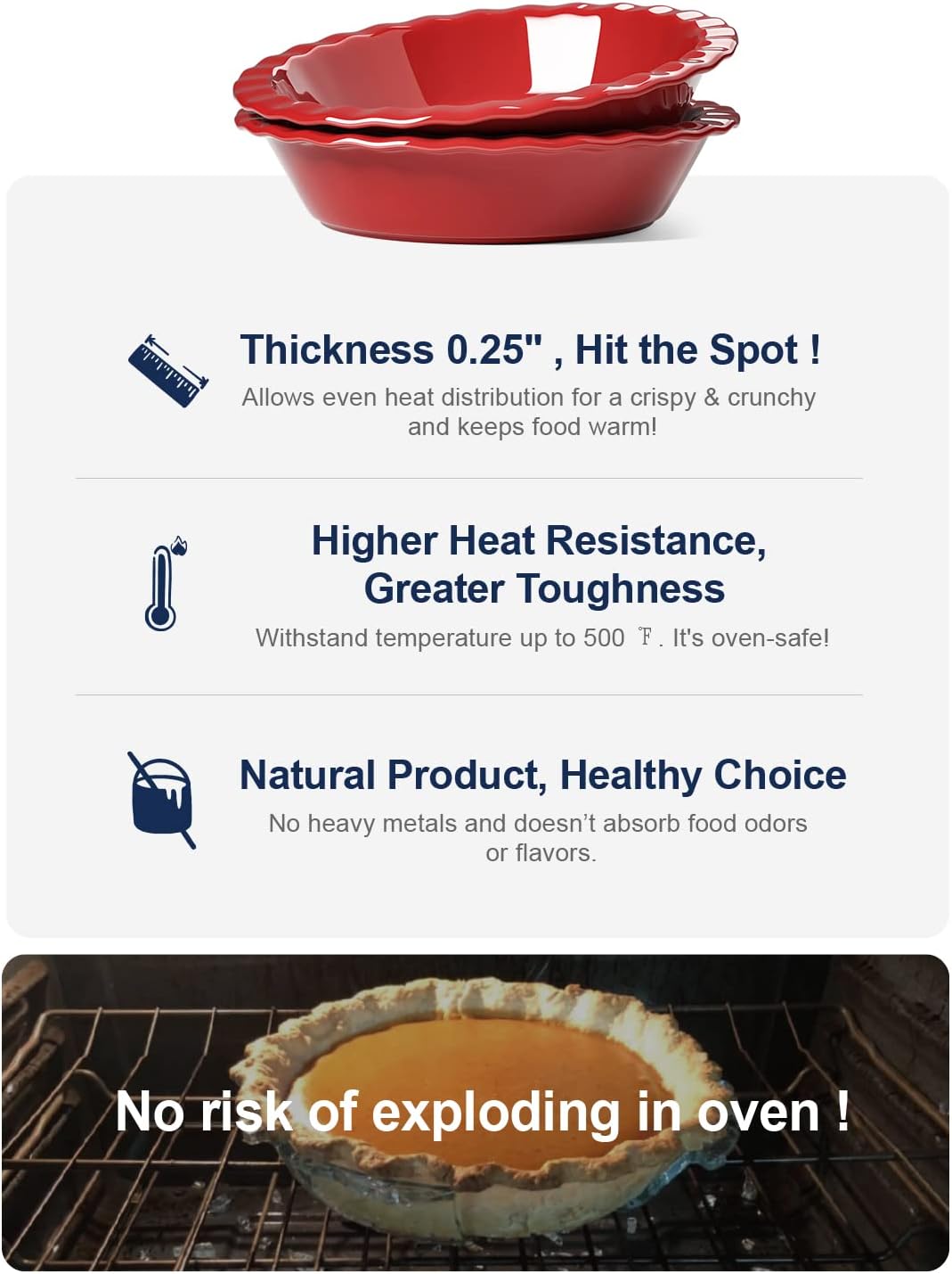 LE TAUCI Ceramic Pie Pans for Baking, 9 Inches Pie Plate for Apple Pie, Pecan Pie, 52 Ounce Deep Pie Dish, Set of 2, Red