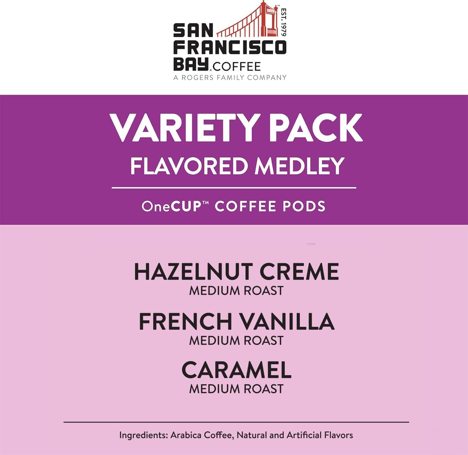 - The Flavored Medley Variety Pack includes four fun choices – Caramel Coffee, Cinnamon Crumb Cake, French Vanilla, and Hazelnut Creme.
