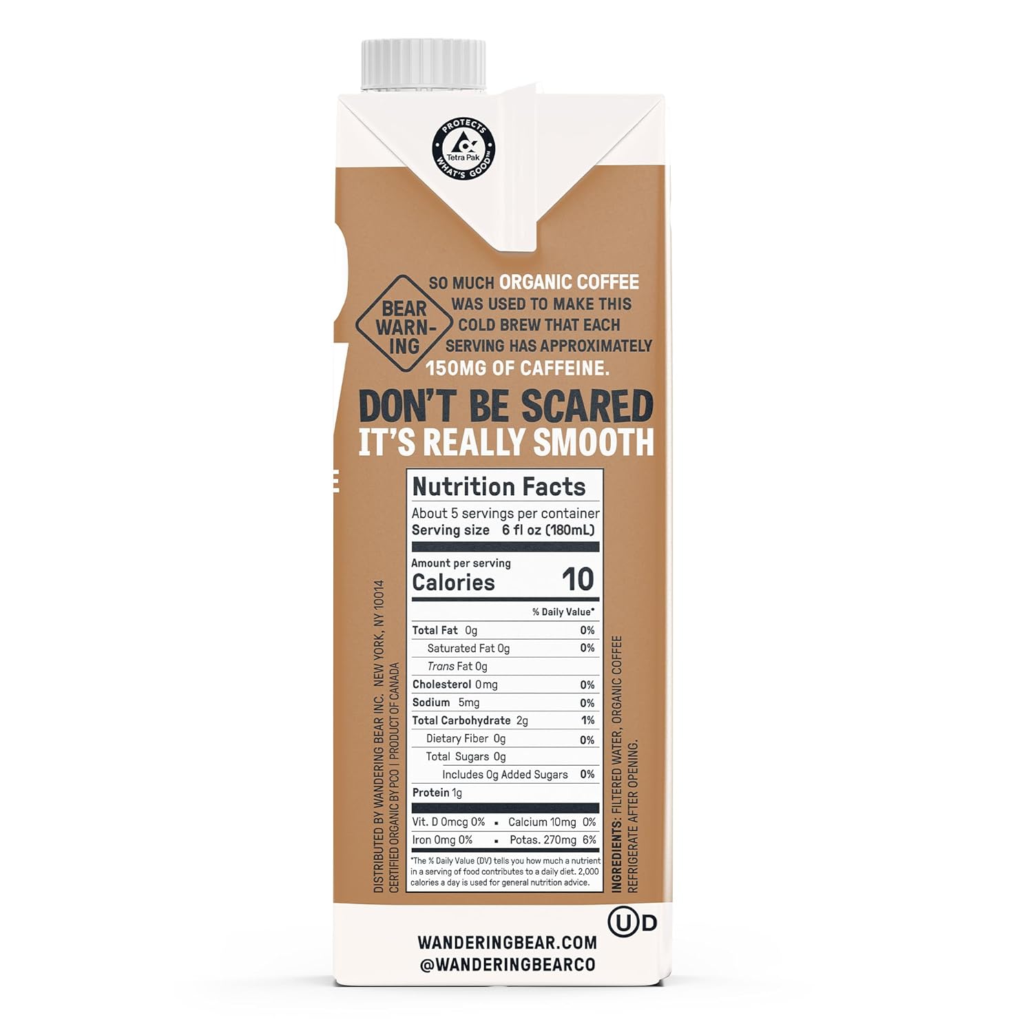 Wandering Bear Straight Black Organic Cold Brew Coffee, 32 fl oz, 6 pack - Extra Strong, Bold, Smooth, Unsweetened, Shelf-Stable, Ready to Drink, 100% Organic, Iced Cold Brewed Coffee Drinks