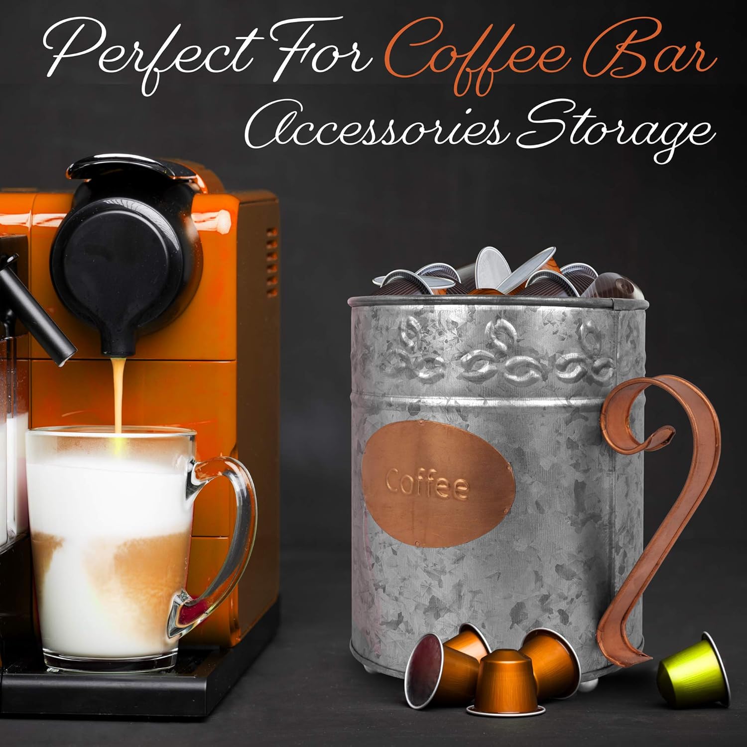 - 【Shabby Chic Pod Storage】With a beautifully embossed coffee bean detail near the rim for an authentic old-world charm and tastefully curved handle for understated elegance, Autumn Alley Farmhouse Galvanized Coffee Pod Holder adds the quaint grounded charm of farmhouse country chic design. This piece of rustic décor or farmhouse décor is the perfect place to display and store your coffee and tea accessories like pods, capsules, and creamers.
