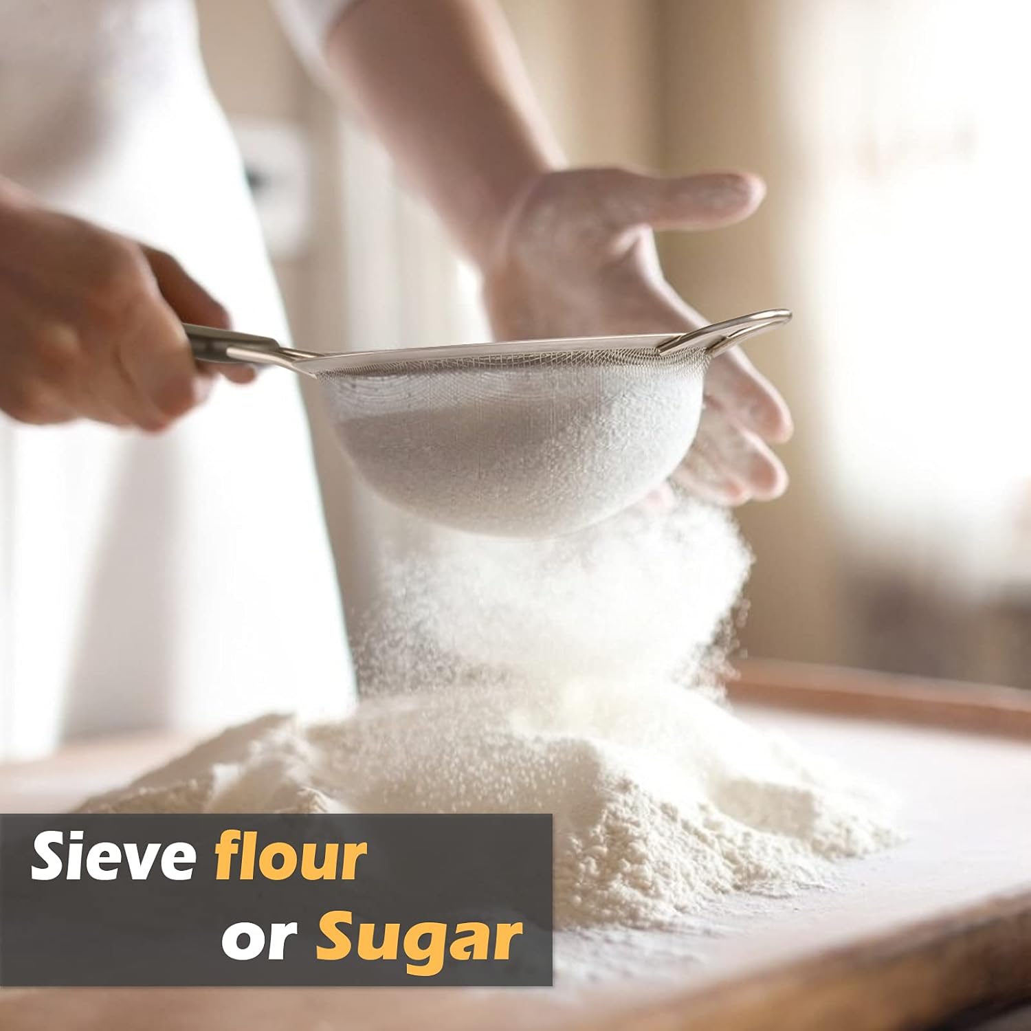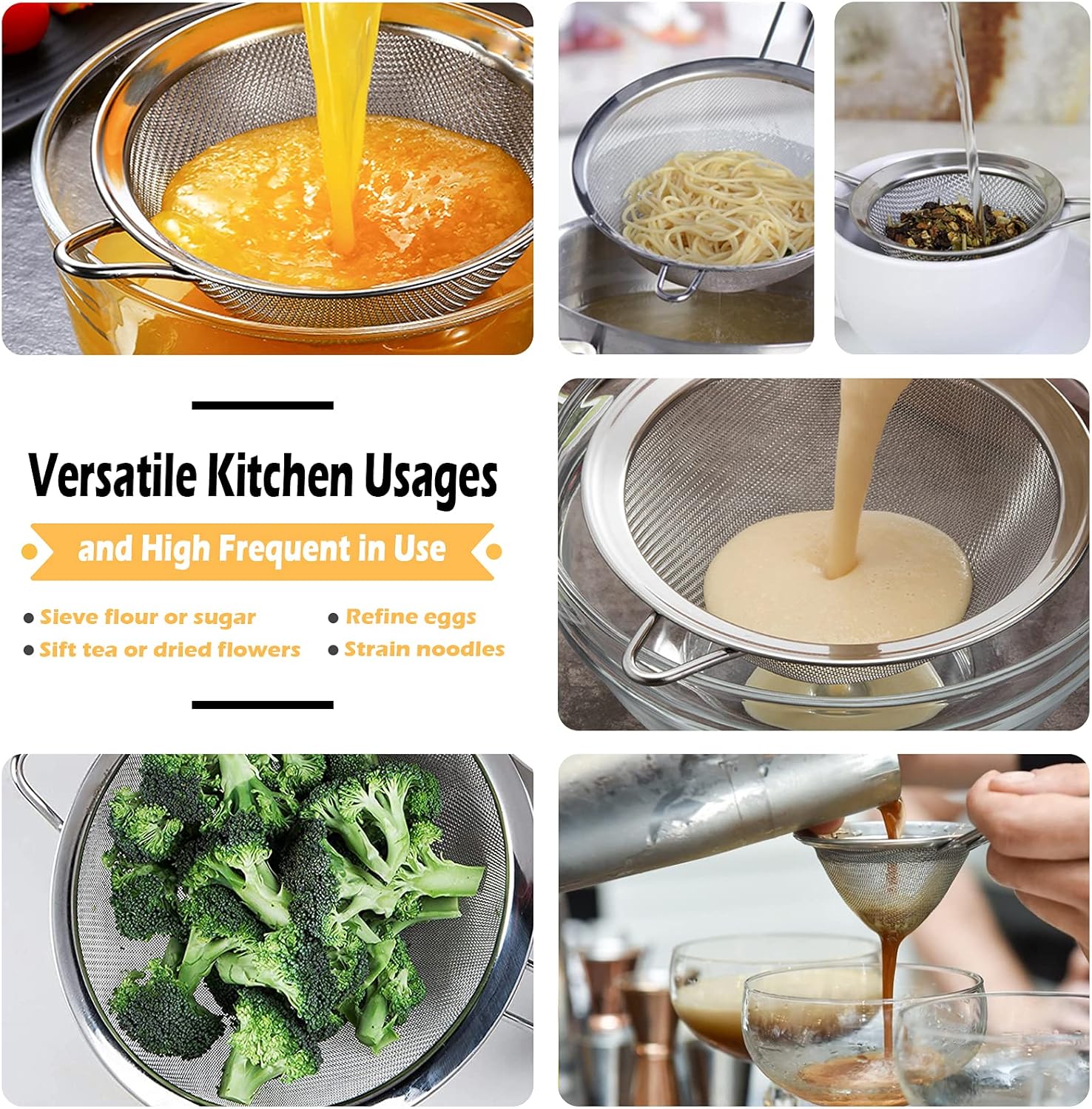 - 🍅🍞SET of 3 FINE MESH STRAINERS: 3 graduated sizes provide various choices. The biggest one is suitable for Pasta, rice and hot vegetables. The medium can regard as a flour sifter to sieve flour, powdered sugar and bran in wheat. The small strainer is perfect for tea, quinoa or coffee.