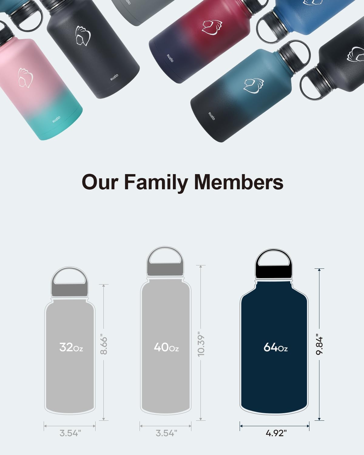 - There is Always One for you: BUZIO insulated water bottle meets your imagination in all aspects of drinking, from the comprehensive sizes (32oz-64oz) to classical and stylish designs, from the production materials to convenient accessories. Come to BUZIO, there is always one for you.