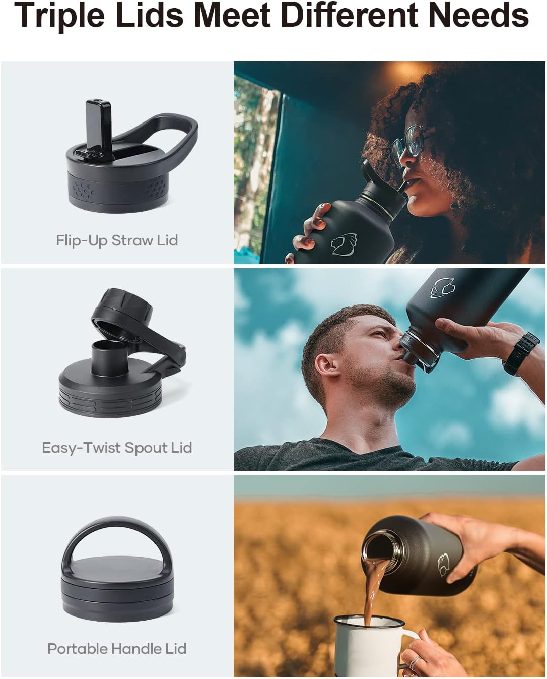 - 3 Caps Pack, 100% Leak-Proof: BUZIO stainless steel water bottle comes with 3 lids: portable handle lid, easy-twist spout lid, and flip-up straw lid to meet camping, hiking, cycling, fitness sports and more. Each lid has a thickened 360° seal for 100% leak-proof.