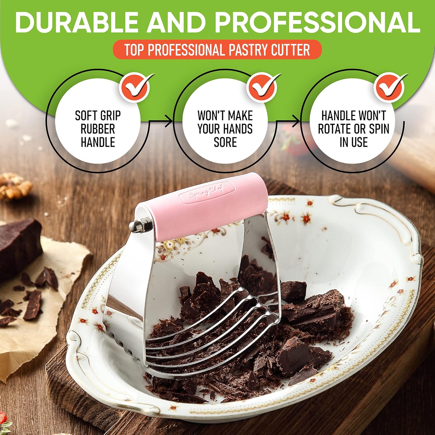 Spring Chef Medium Size Dough Blender For Baking, Stainless Steel Dough Cutter Tool, Manual Pastry Cutter Tool with Sharp & Thick Blades, Dishwasher Safe Pastry Blender for Easy Mixing - Pink Lemonade