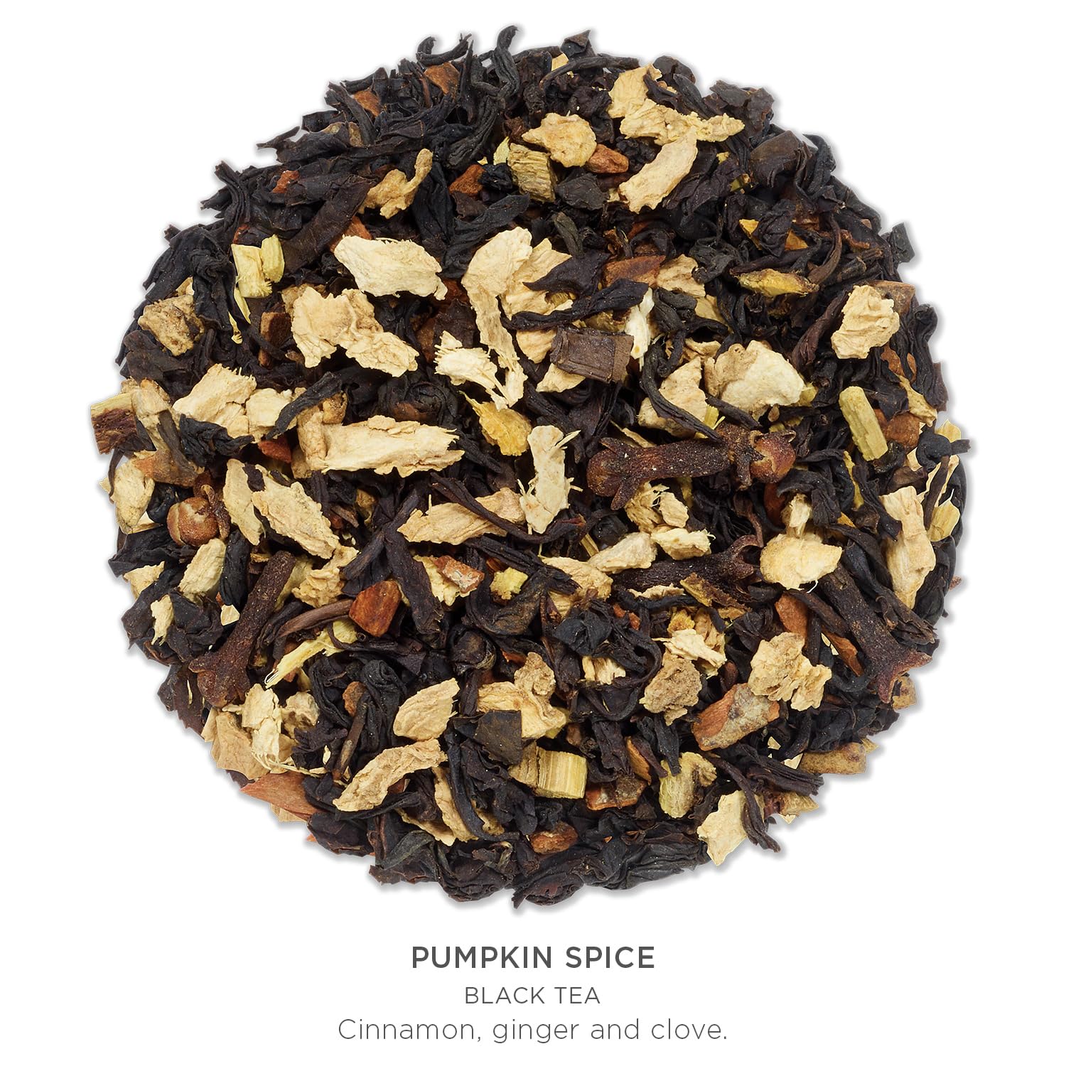 - PUMPKIN SPICE - Introduces a trio of classic fall spices which are cinnamon, ginger and clove to organic black tea leaves, culminating in the perfect blend of autumnal flavors.