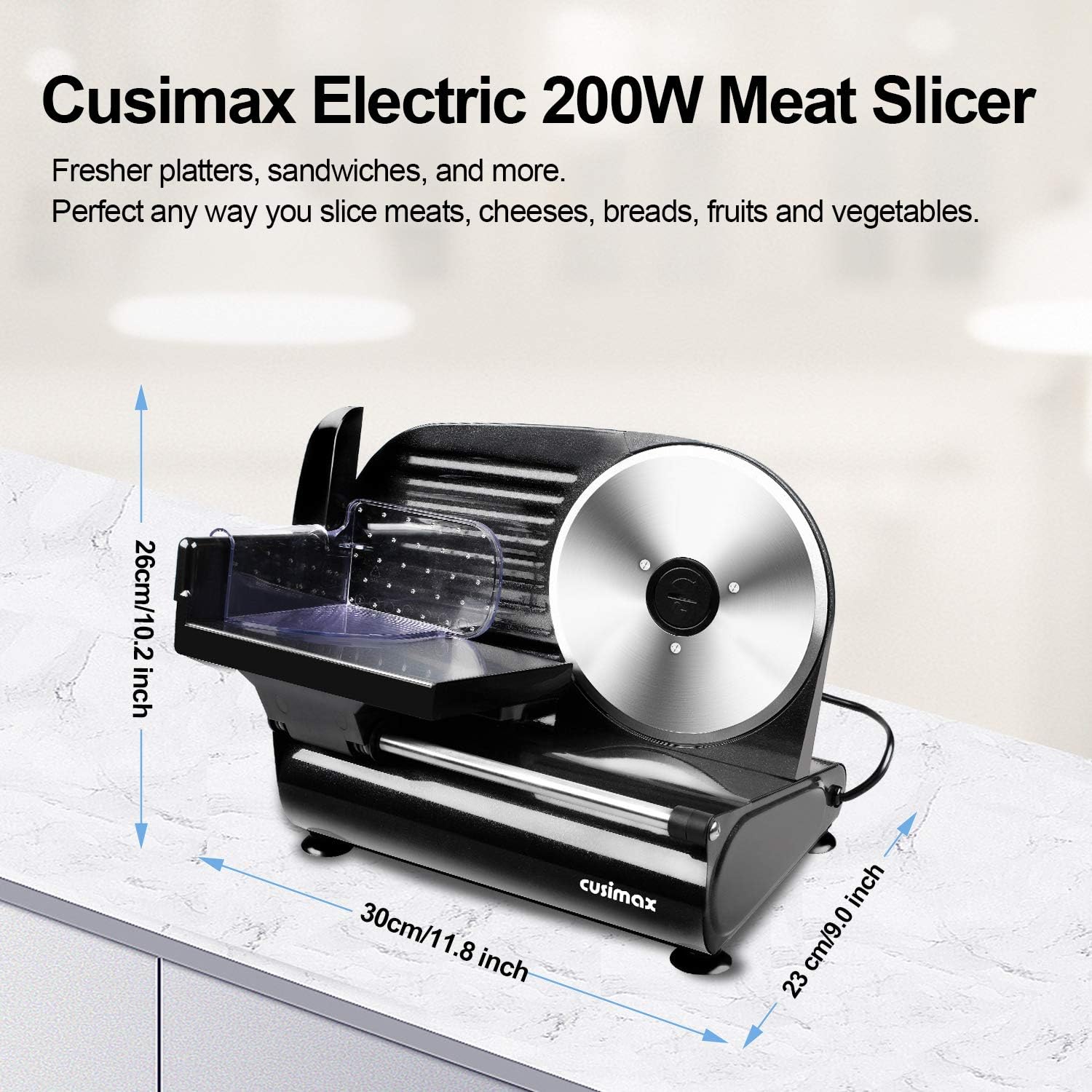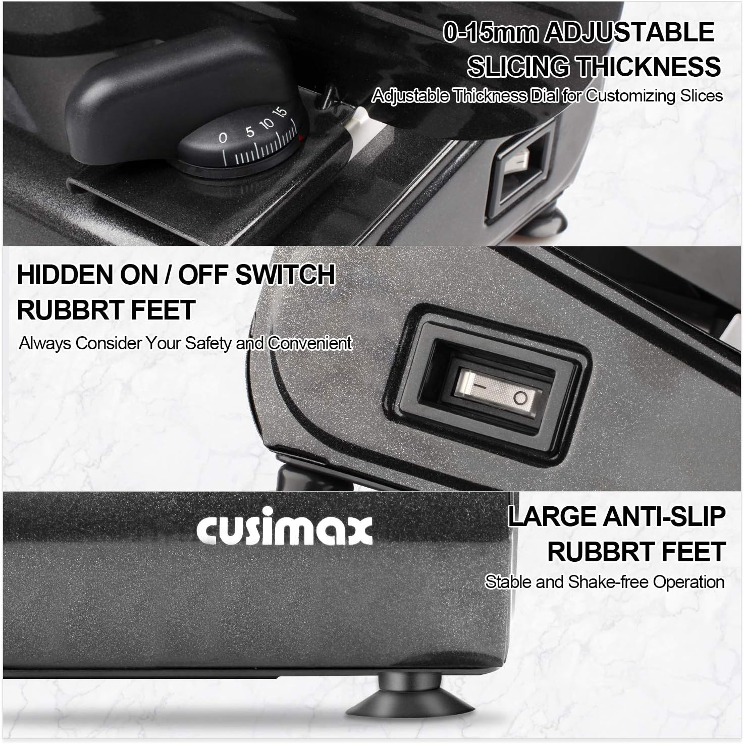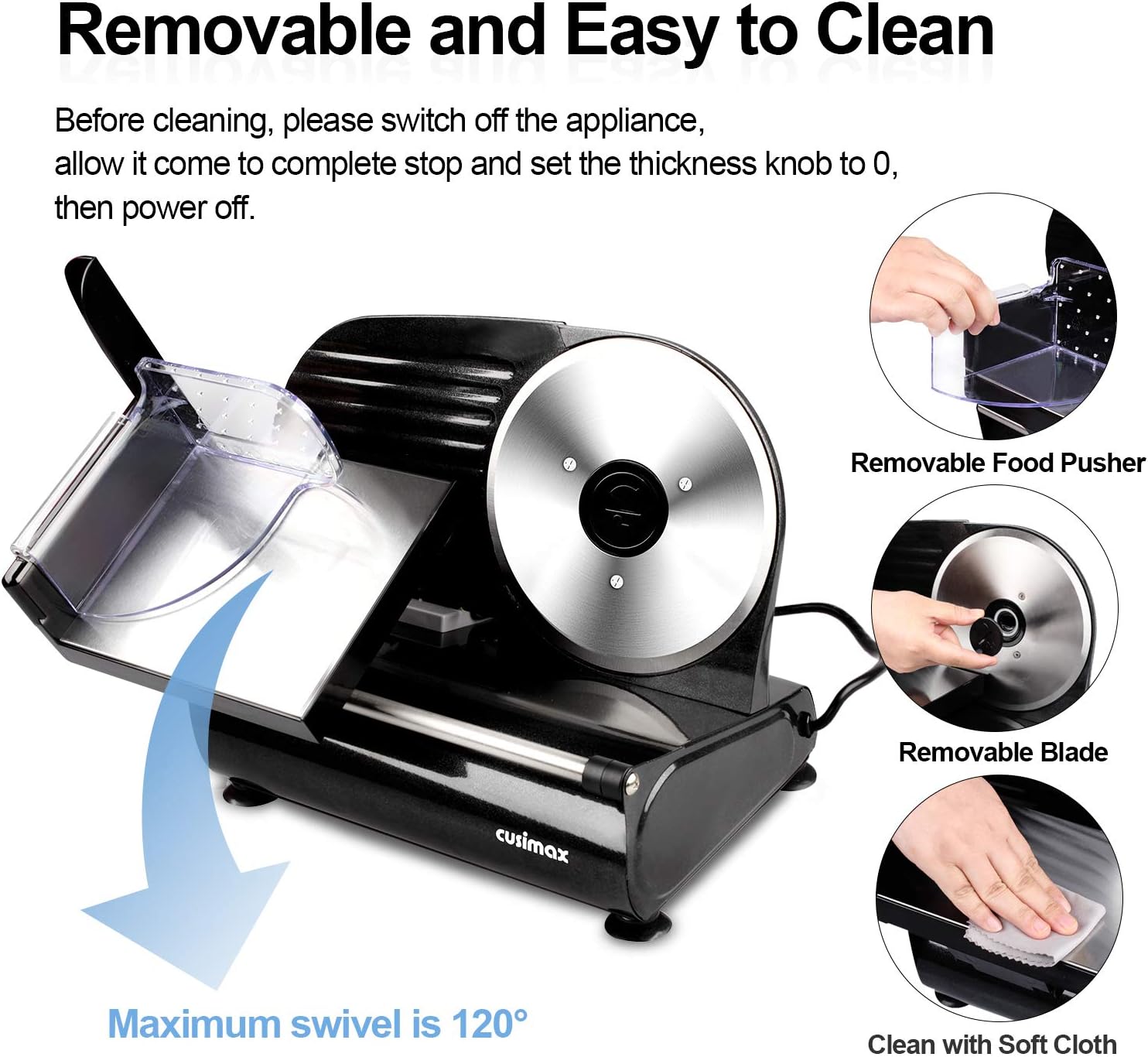 - Easy Clean & Safe - CUSIMAX meat slicer never worry about how to clean up the food hidden in it. Hidden track design and removable blade make it easy to clean the food slicer machine. Sturdy non-slip feet, blade safety guard and food pusher ensure that the food slicer will stay in place so you can keep a firm grip while operating