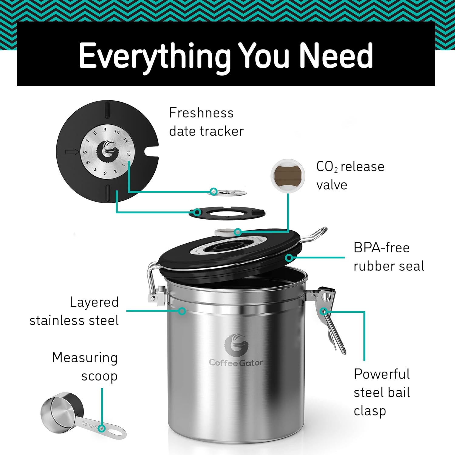 - Pro-Grade Freshness : Preserve coffee flavor and aroma with Coffee Gator airtight container featuring a CO2 release valve that protects beans from moisture and oxygen while allowing gases to escape naturally