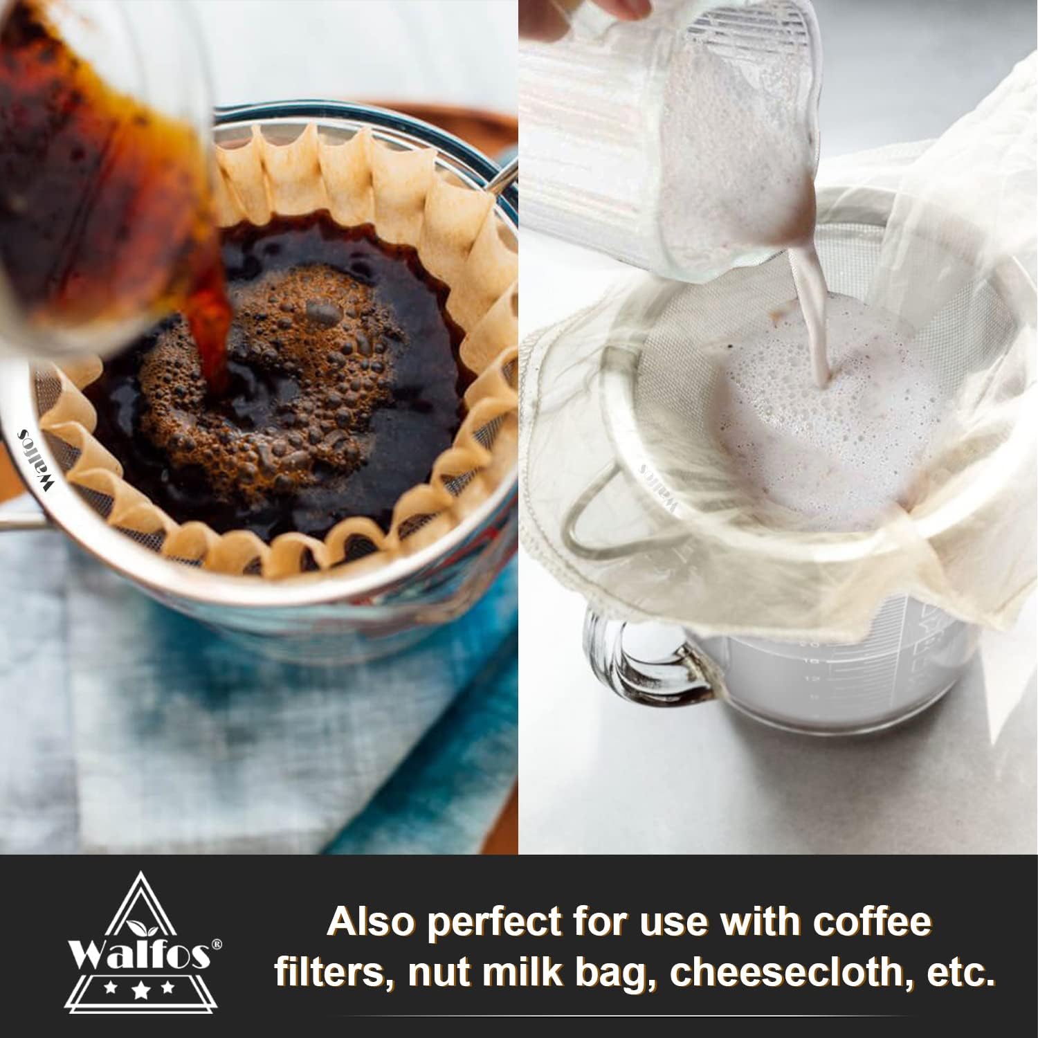 - 9” LARGE MESH STRAINER WITH HANDLE: WALFOS Large strainers allow you to strain rice, quinoa, pasta, fruit, etc.. And the firmly welded handle and thick resting-ear help free your hands by resting the kitchen strainer on the pots without slipping. WALFOS 30 mesh metal strainer is built to last