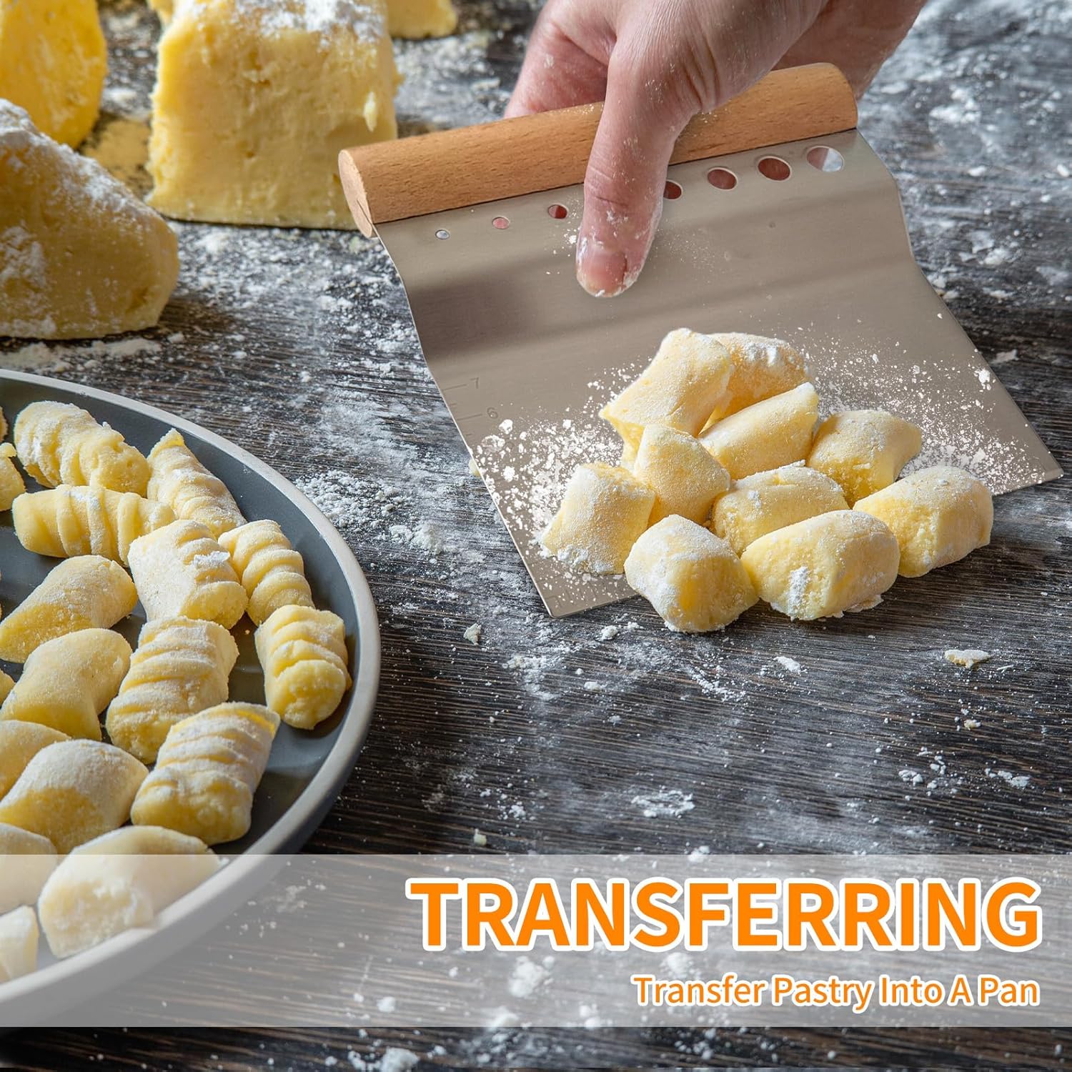 - Double Side Marks: Featuring advanced laser engraving technology, our pastry scraper is designed with clear measurement markings that won't wear away over time. The measurement scale ensures equal dough portions without the need for extra tools. Additionally, a conversion chart is included for your convenience.